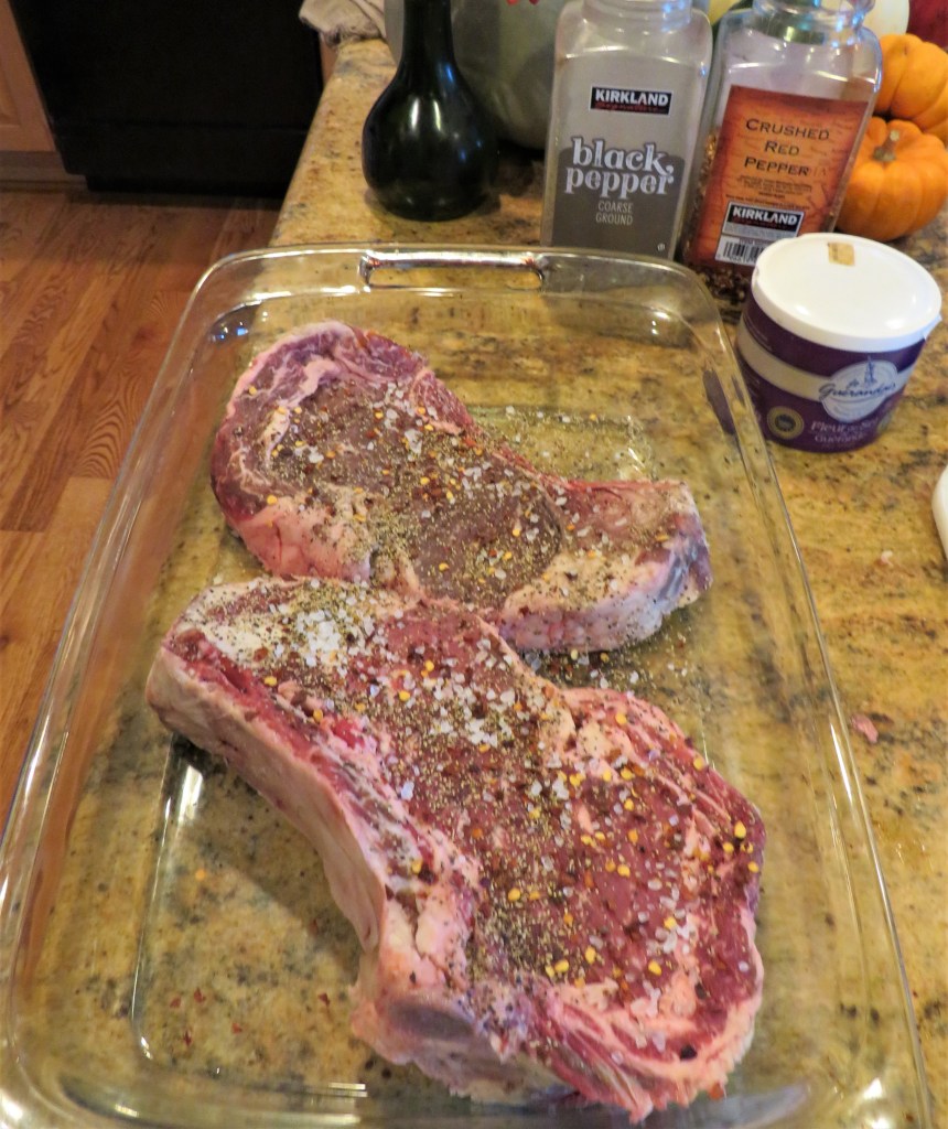 Pat the steak dry with a paper towel, then season with salt, pepper and red pepper flakes on both sides. Press the seasonings into the steak. Cover and let rest for at least one hour before cooking.