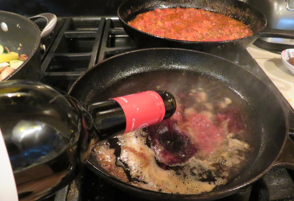 When the steak is crusted all over, remove it from the heat. Carefully add the wine to the pan and let the liquid reduce to about 1/2. Be careful when adding the wine because it will flare up and flambe. You can use either red or white wine. I used red wine because red wine goes better with a tomato sauce.