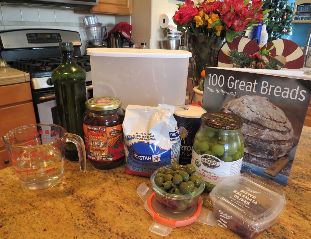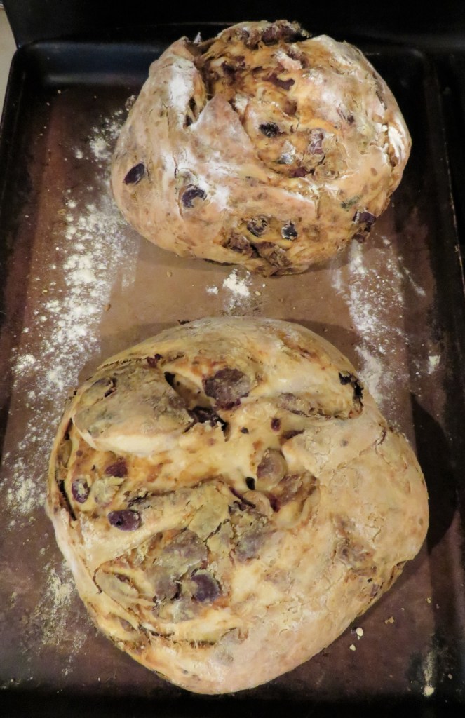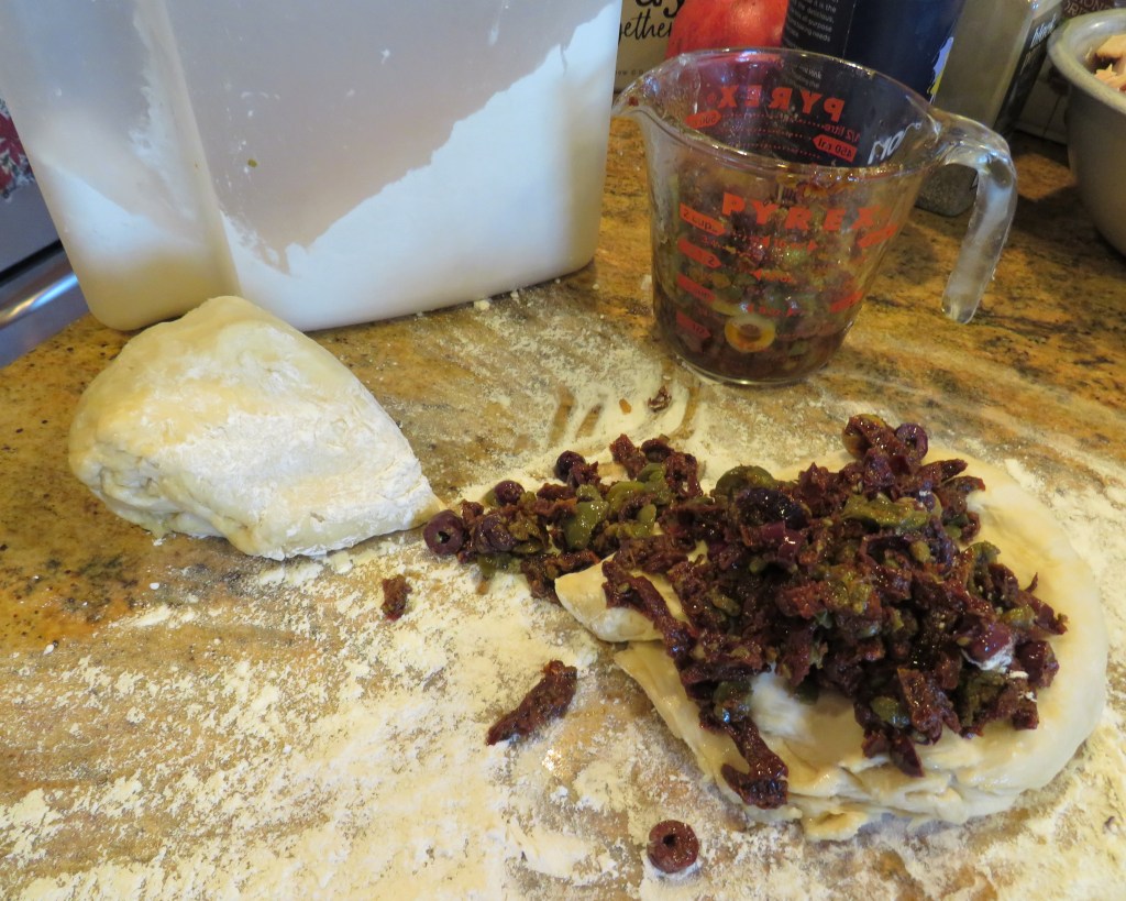 If you add the sun-dried tomatoes and olives before the first rise, then punch the dough down after about an hour and divide it into two. Shape each portion into a round ball.