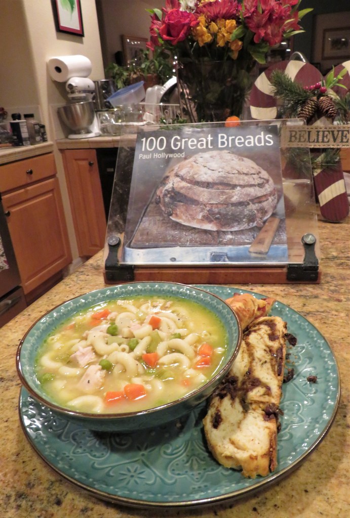 My latest bread baking adventure was the making of some delicious, rustic sun-dried tomato and olive bread. YUM!!!! We ate the better part of one the loaves the other night, with our turkey soup. Turkey Soup I still have another loaf left, that will most probably be enjoyed with dinner tonight. πŸ™‚