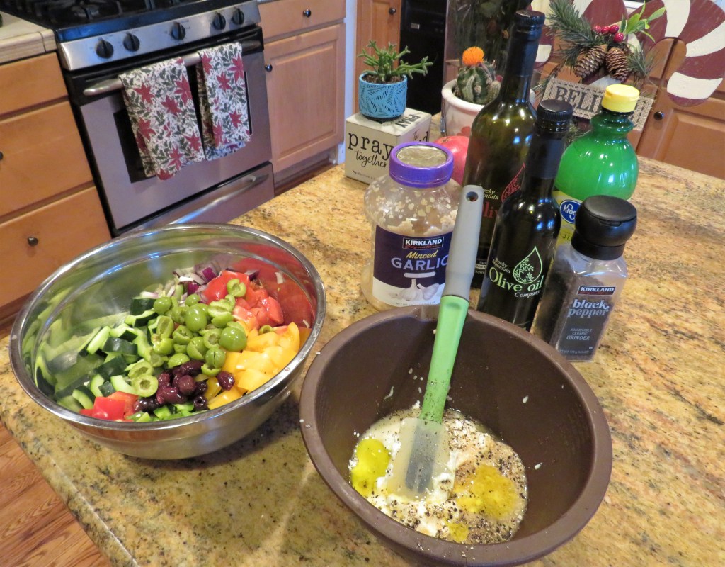 I like cooking in themes. For instance, if I am making Italian, the whole meal will be Italian, or Mexican, on in this case Greek. Once again, I was inspired by using up some of my leftovers and planned the rest of the meal around them. “The Queen” and I always get very creative when re-using our leftovers.