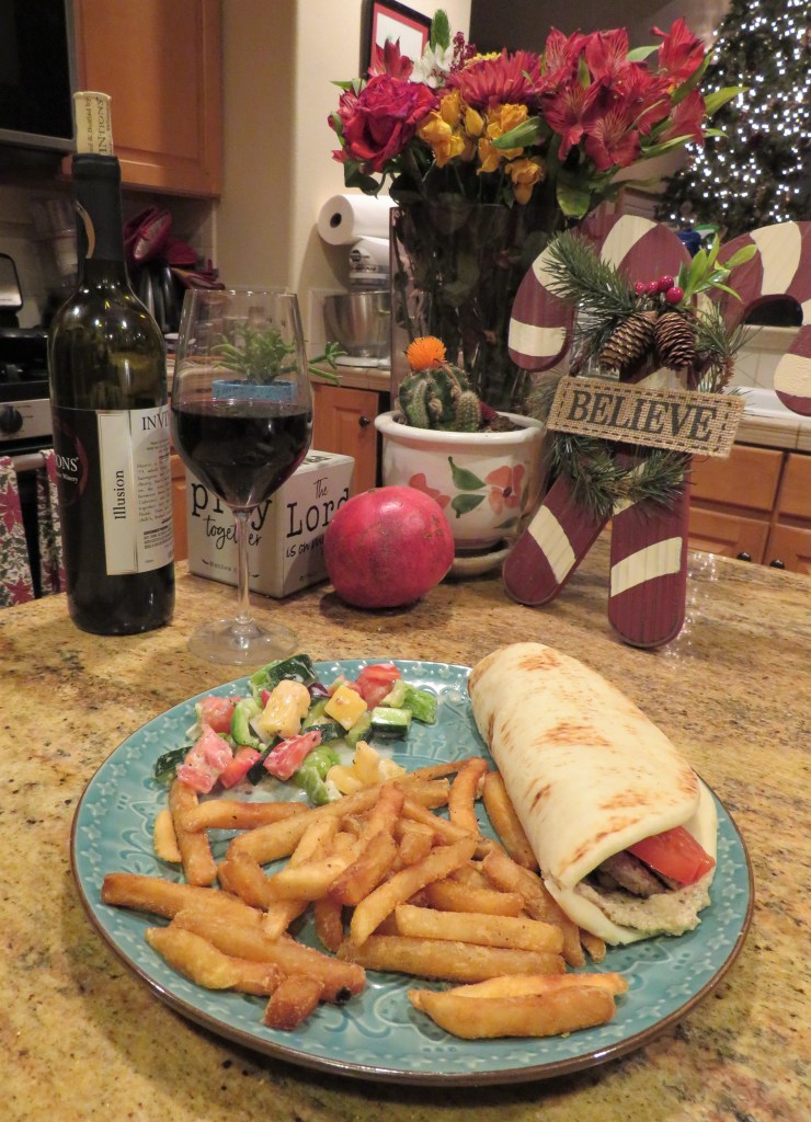 We have a friend staying with us for while and someone had given him some of their leftover lamb chops. I also had some hummus to use that my neighbor had given to us. Well, at the moment I am cooking for three, and there was no way I could stretch just one lamb chop three ways. I’m good, but I’m NOT that good. πŸ™‚ So, I used that lamb chop and sliced it into thin strips and mixed it with some leftover steak, also cut into thin strips. Gyros were made with the meat. You’ve seen me do this before, a number of times. Quick and EasyΒ Gyros, California Gyros OK. The main course is set. Now I just needed a side dish or two to go with it. I made a delicious Greek vegetable salad and some French fries to go with the gyros. I made this delicious and filling meal at home, using up some of my leftovers. Had we gone out to eat, a very similar meal would have cost us about $50 or more for all three of us.