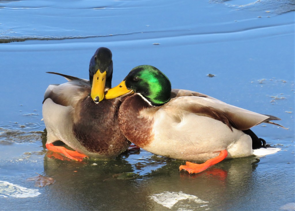 I have been living and walking around my lakes for 17 years now, and I still see new things all the times. Life is never boring around here. Today, I had yet another first. I saw two mallards fighting each other. It was a test of who will be the king duck of the lake, and a little struggle of male domenence. There were lots of onlookers too – quite a few Canadians and Cacklings, as well as other Mallards. I think they finally kissed and made up though. I didn’t see any bloodshed.