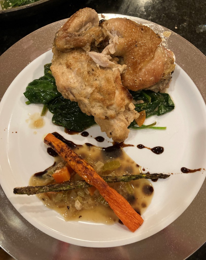 Stop #3 was for the main course, dinner. Our host prepared a fabulous, and historic dinner that was on the menus for both the Atchison-Topeka Rail Lines and the Titanic. He made Cornish Game Hens roasted with a vegetable mire poix (carrots, celery and onions) and vegetable ragout served over a bed of sauteed spinach with a balsamic reduction sauce. He thoroughly enjoyed showing off his culinary skills, and he did an amazing job too.