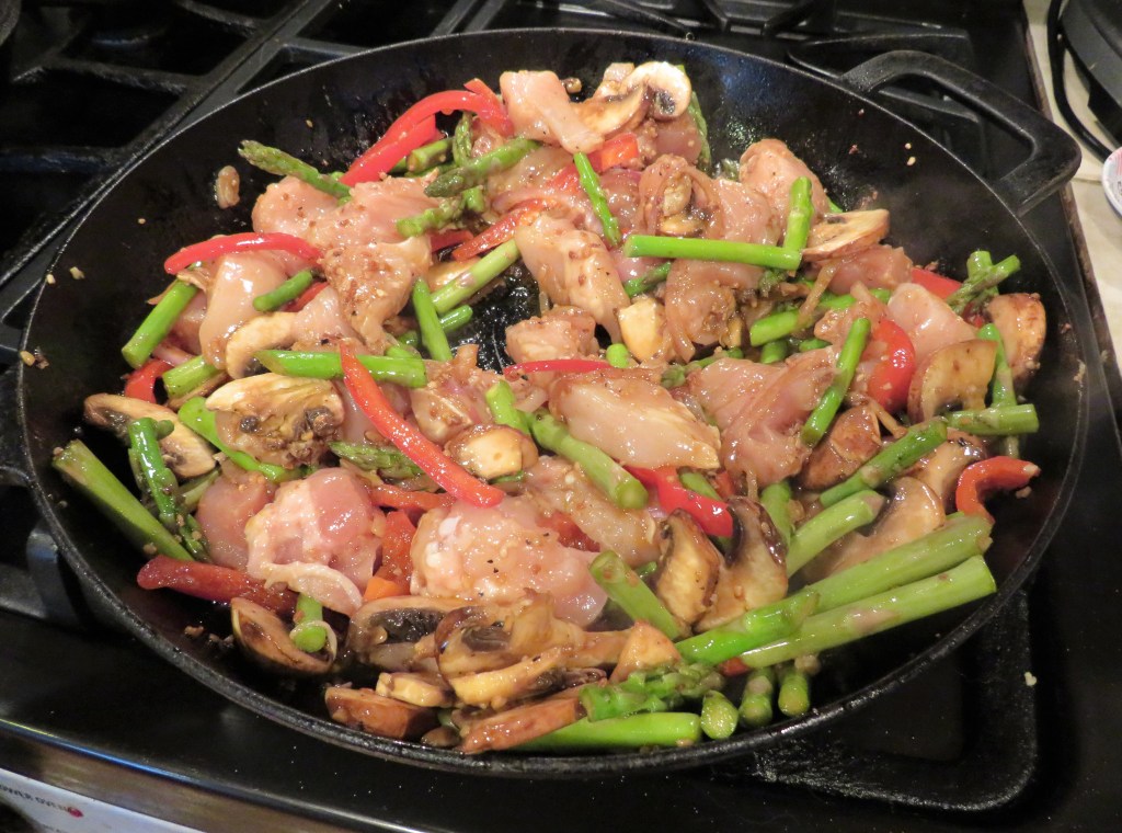 Stir-fries are always a good option to make. They are quick and easy to make and always taste good too. They are also very versatile, and anything goes. I tend to add a lot of vegetables to my stir-fries too, making them even healthier. For instance, this particular recipe only called for asparagus. I love asparagus, but I love a lot of other vegetables too, so I added some mushrooms, shallots, and red peppers as well. It made the dish deliciously colorful and healthier with the added extras.