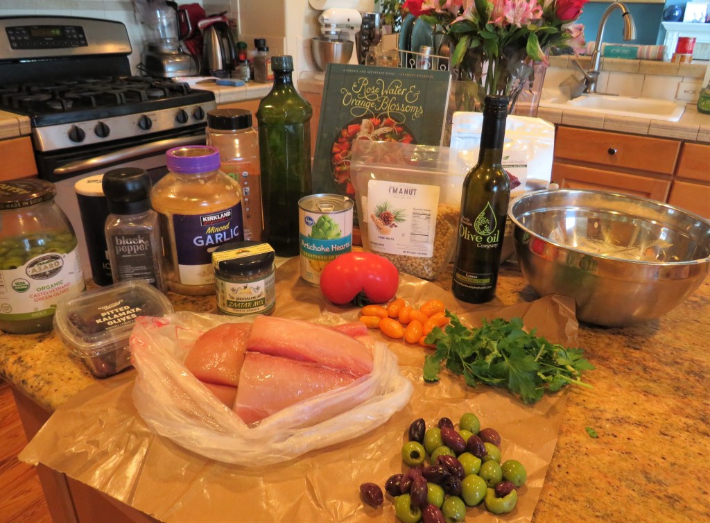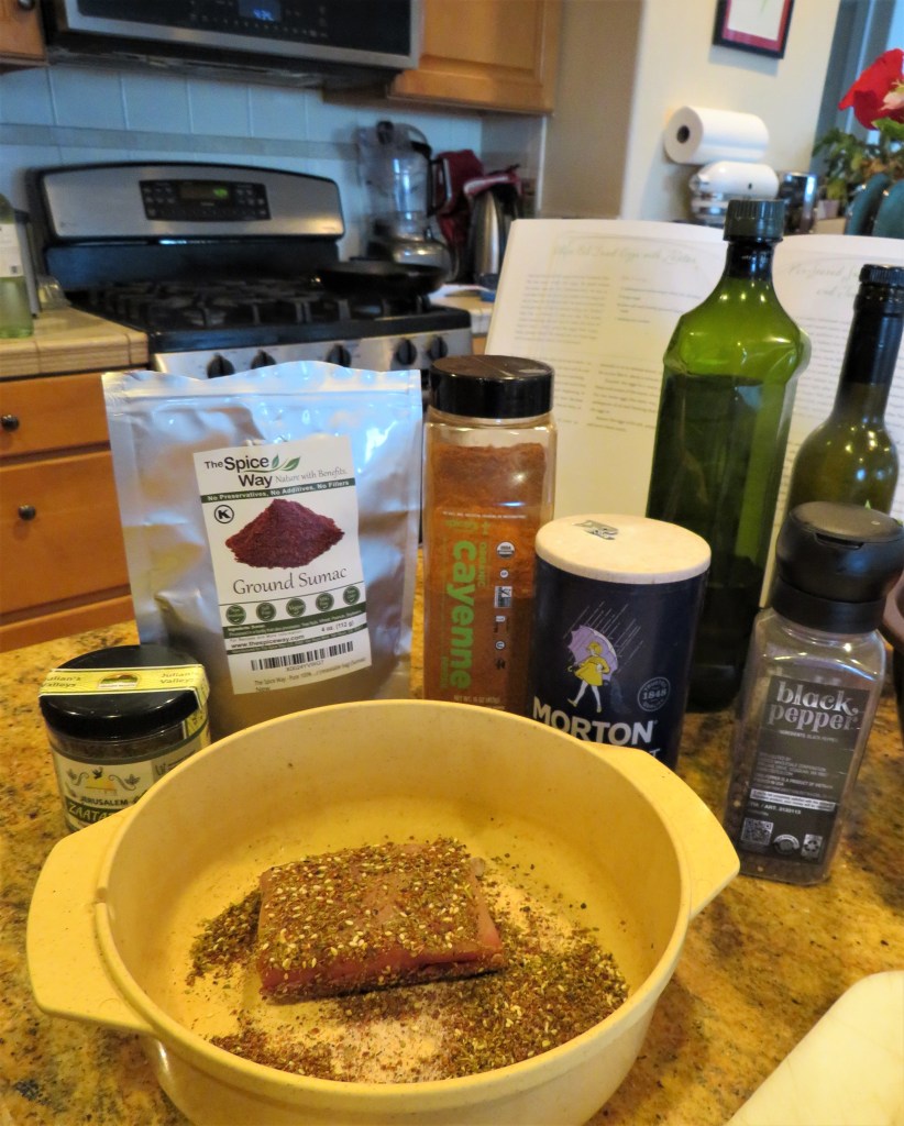 The recipe called for snapper, but I couldn’t find any, so I substituted mahi mahi instead. That was my first change. Then I added both the Sumac and the Za’Atar to the seasonings for the fish before cooking it up. That was change #2. My 3rd change was to add a variety of Middle Eastern vegetables, and for my 4th and final change, I steamed it all in white wine. So, I was most definitely inspired by the delicious recipe in the cookbook, but then I completely made it my own. Funny. This tends to happen, oh all the time. :)