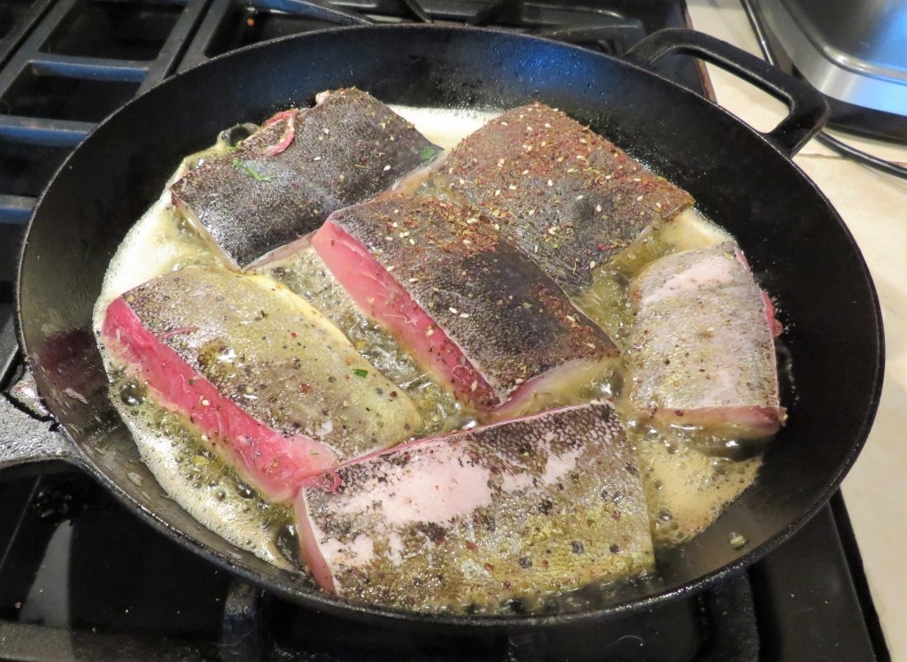 Get a large skillet very hot, the add the oil(s) and the butter. Place the fish in the skillet, skin side up and cook the fish for about 3 minutes on a medium-high heat.