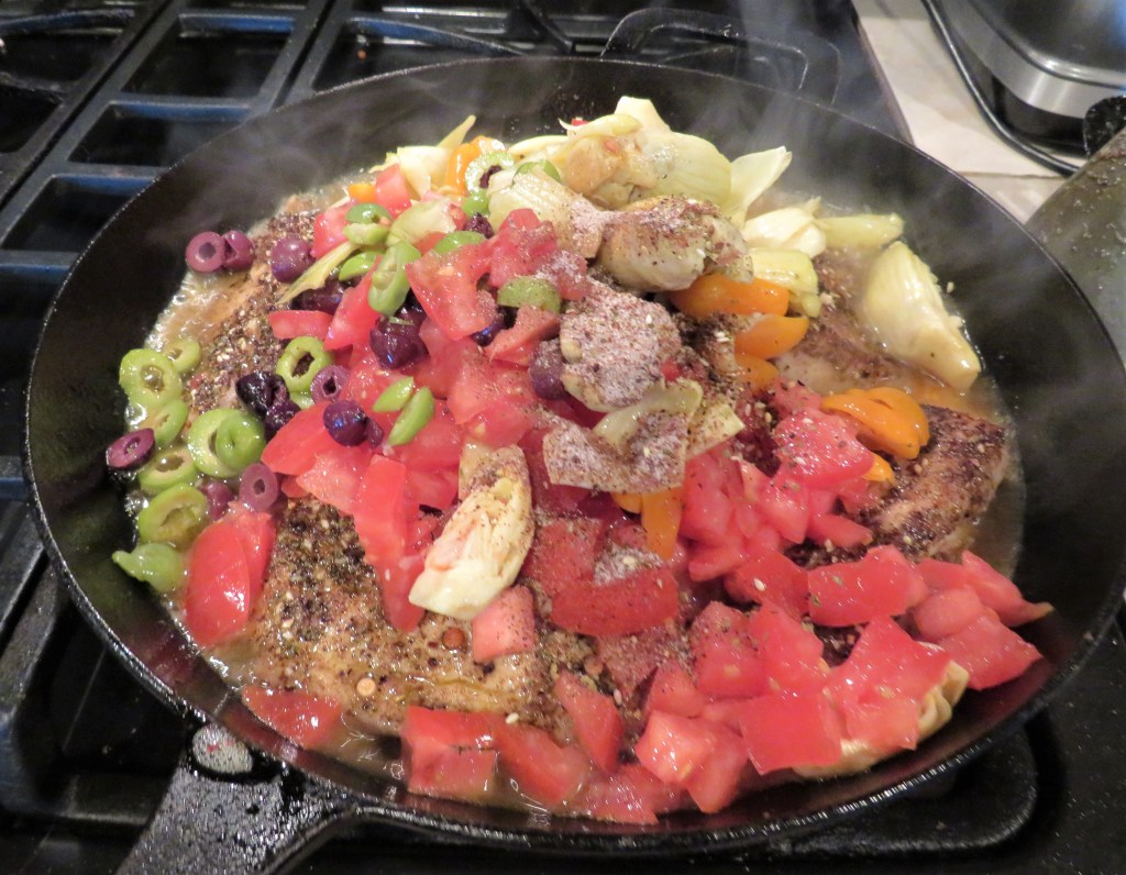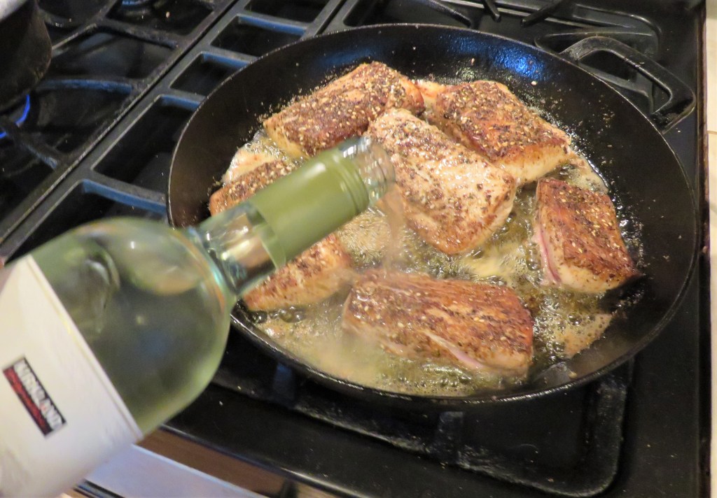 After 3 minutes, flip the fish, add the vegetables, the wine, and the rest of the spices, if there are any left, cover and let steam for about 5-7 minutes, or until the fish is thoroughly cooked.