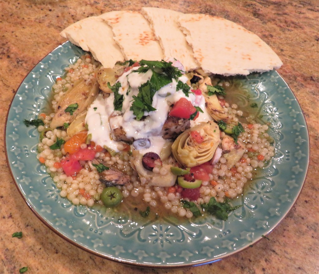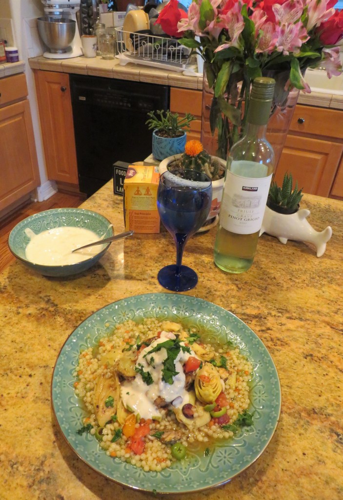 Once the fish is cooked and the vegetables are warmed, serve it over cooked couscous. Add some of the tahini yogurt sauce, the pine nuts and parsley on top and serve with the same wine you used for the sauce and enjoy.
