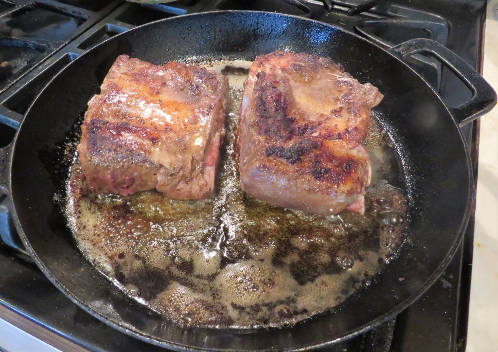 Sear the lamb on all sides in a VERY hot skillet with the olive oil and butter for 3 minutes per side. You can also use avocado oil. If you just sear the meat in olive oil alone, olive oil has a lower smoke point, because it is not “fatty” enough, and will burn.