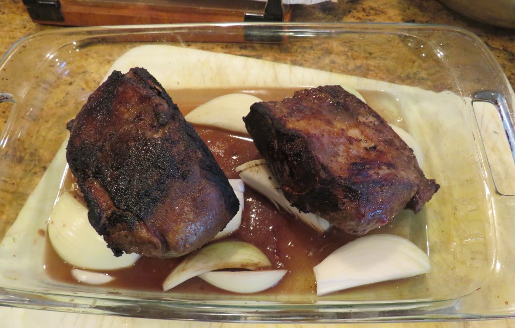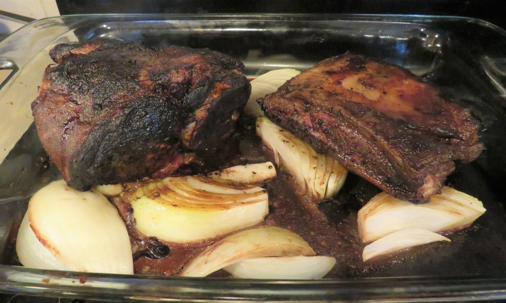 When the meat has a crusted coating all over, place it on top of the onion wedges and roast for about 1 1/2 hours, or until the internal temperature is about 130* F or 55* C. The best way to eat lamb is rare to medium rare. Anything much beyond will make the lamb very tough and it will be more like shoe leather. Reserve the marinade and cook down to thicken and serve over the lamb once it is done.