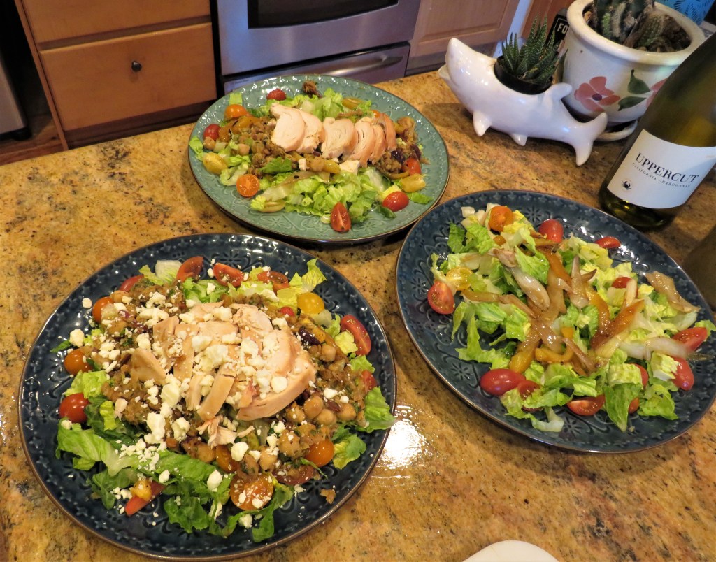I turned the first version, which to me was more of a side dish, into a meal. I put it all on a bed of shredded Romaine lettuce, added some grilled onions, more olives and more tomatoes, and topped it all with grilled chicken. The boys both had Feta cheese added to theirs too. Then I dressed it all up with a champagne vinaigrette. Delicious!!!!
