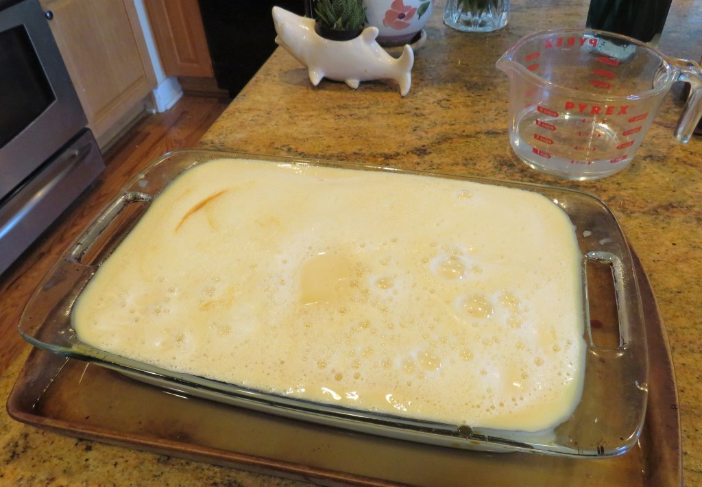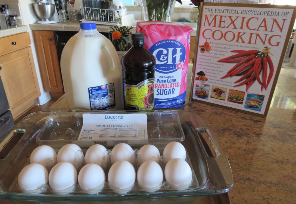 This delicious dessert only requires a few basic, simple ingredients. It is all in the techniques of how it is made that make the difference between a good flan and a great flan. I doubled my recipe, but I will give you the actual recipe, to make in smaller individual servings, if you like, though you can still present it however you choose to. Some people like to bake it in a cake pan, or like I did, a 9×13 baking dish.