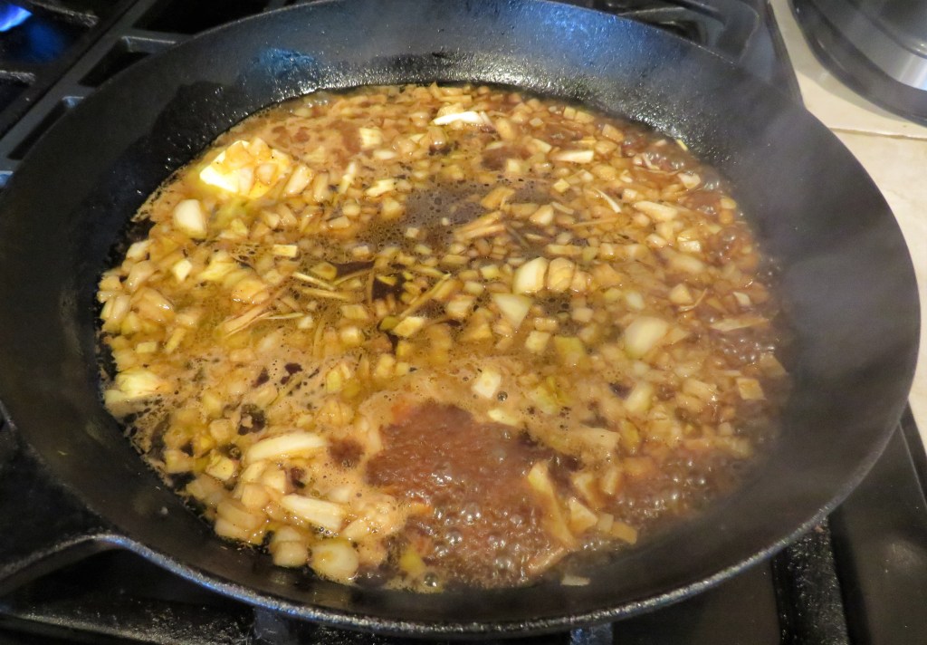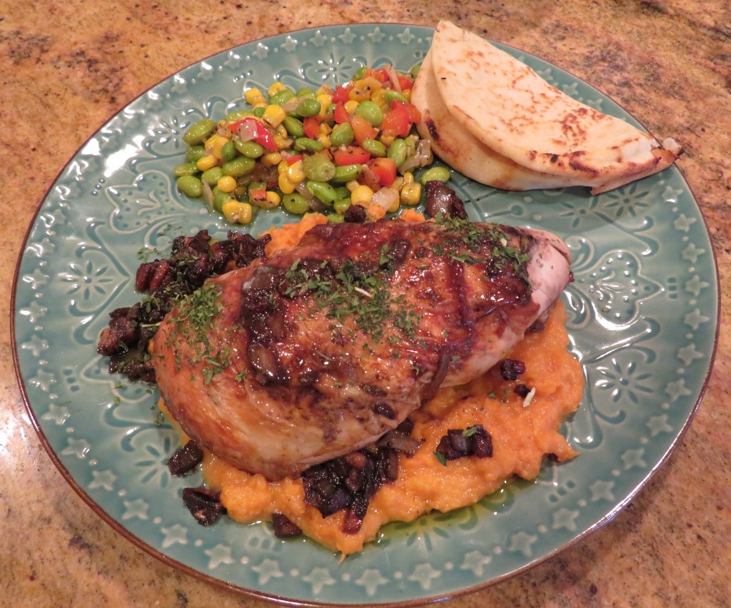 Then serve and top with more of the sauce. This sauce went very well with the sweetness of the mashed sweet potatoes too. They complimented each other very well. I served a chilled Pinot Grigio on the side, to complete the meal.