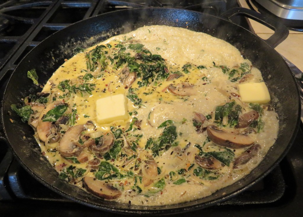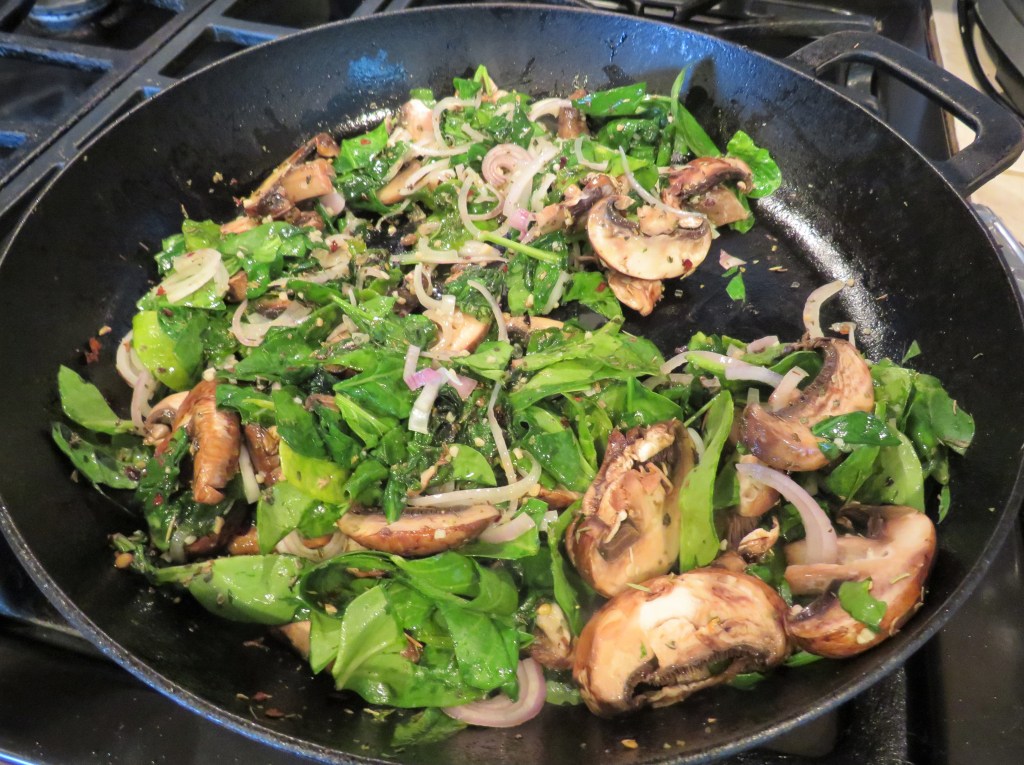 Get a large skillet very hot and add the olive oil. Then saute the shallot, garlic, spinach, mushrooms and spices for about 3-5 minutes, or until the spinach is wilted and the shallots are soft and translucent.
