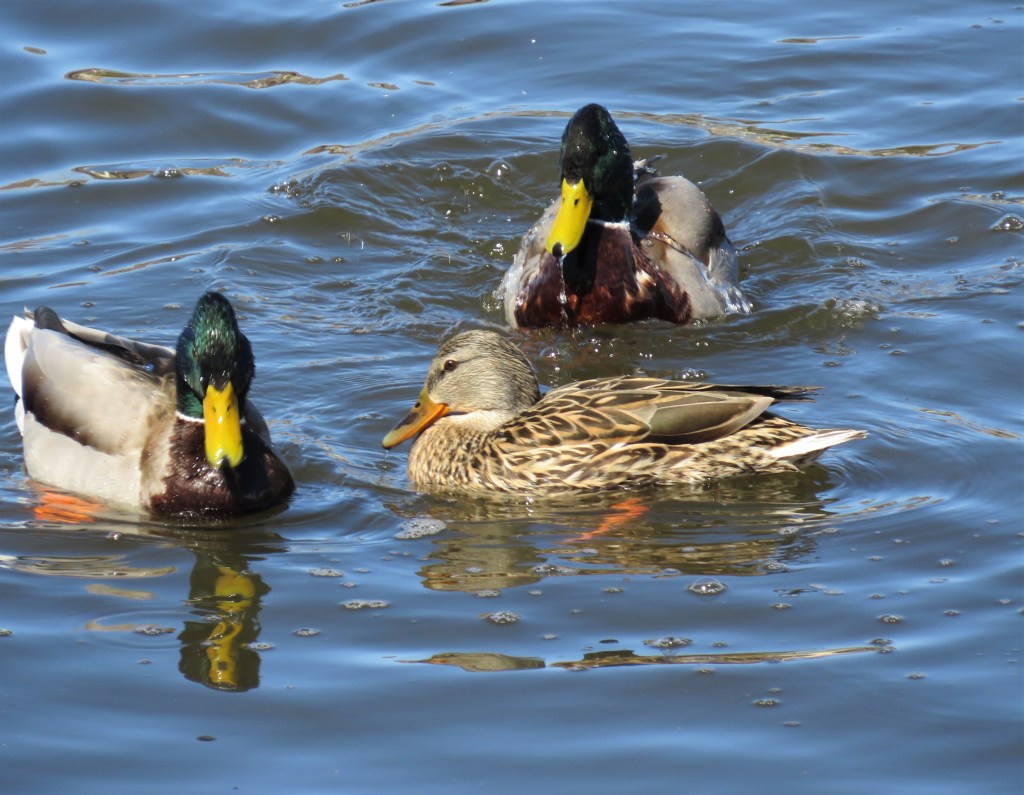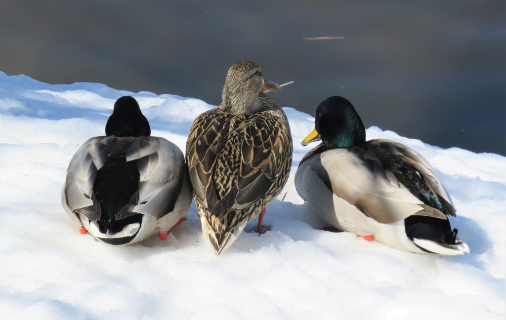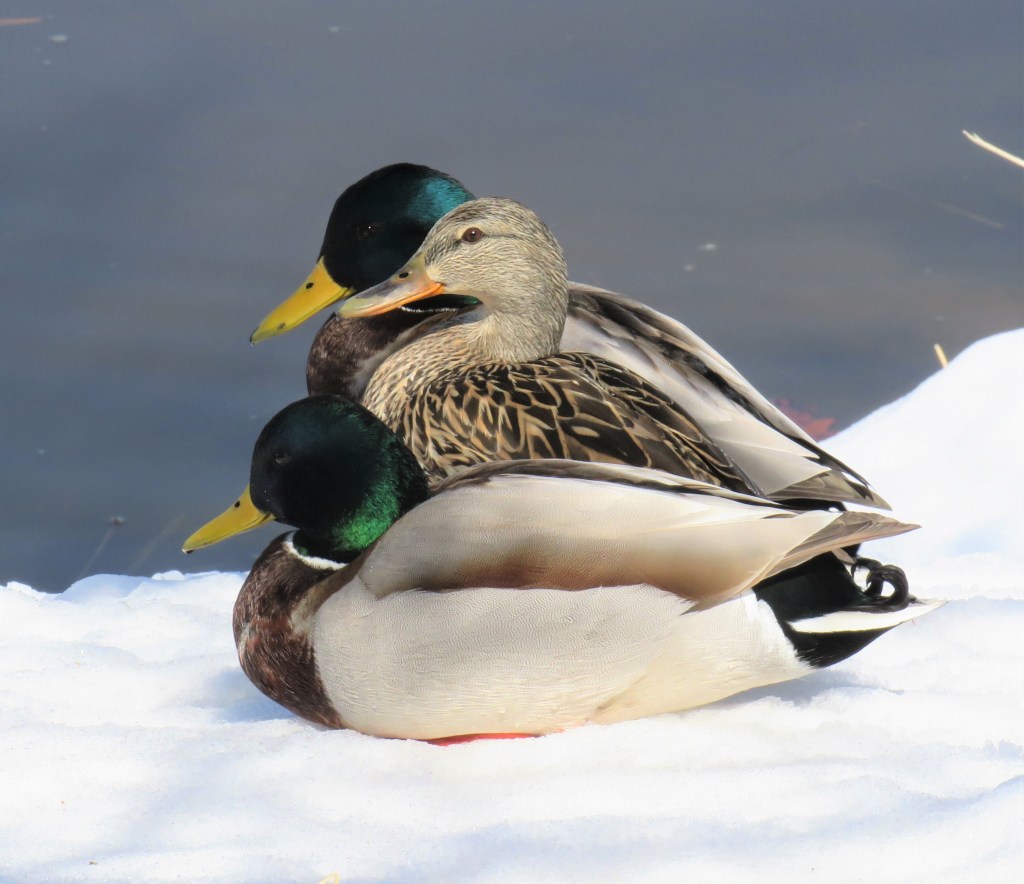 After last week’s snowmageddon, it was a beautiful sunshiny day today. There is still plenty of snow out on the ground, but the sun is out, shining brightly, and the temperature is very nice. The snow has melted from the walkways and the paths, so it made for a beautiful, very pleasant walk. The ducks were enjoying the beautiful day too. For the most part, the lakes were quiet today, however, there were three Mallards, two males and one female, just out having a blast.