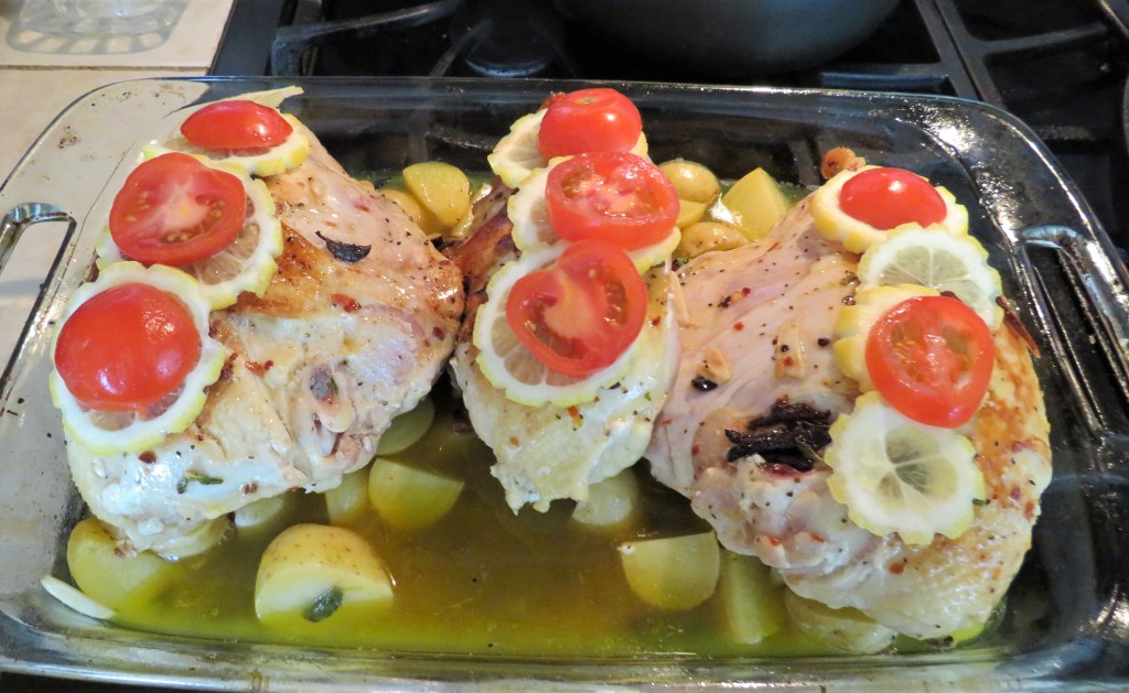 There are so many good recipes out there and way too little time to cook them all, though I try my best to cook as many as I can. I find my inspiration from all kinds of sources. The inspiration for my Greek lemon chicken and potatoes came from our very own Frank Solanki at The Reluctant Poet at https://thereluctantpoetweb.wordpress.com/. Thank you Frank for this delicious idea. Of course I tweaked it a bit to make it my own, but your recipe was my inspiration.