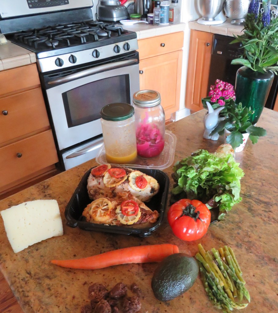 I used my leftover Greek lemon chicken, and the asparagus from that same meal. Greek Lemon Chicken and Potatoes I added some of my pickled onions Pickled Onions I had made earlier for my Old World/New World fiesta Old World/New World Fiesta as well as a shredded carrot, diced tomato, Manchega cheese for Larry and avocado slices for me.