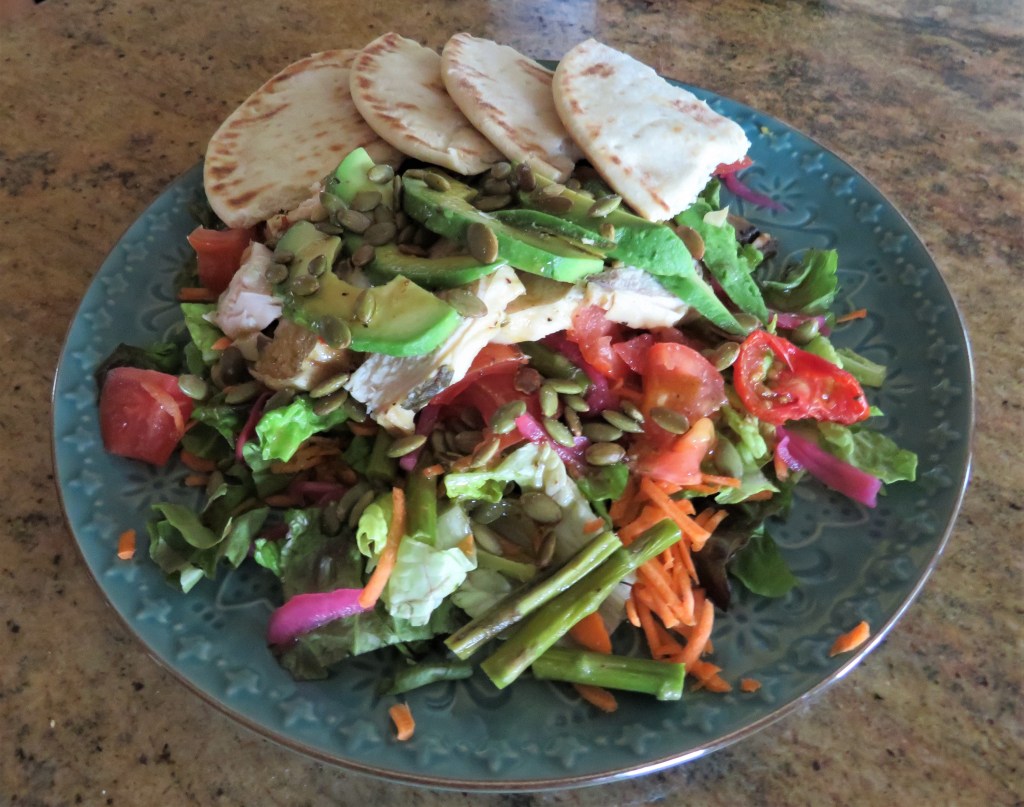Then I topped it all off with the remainder of my lemon vinaigrette Roasted Vegetable Salad with Lemon Vinaigrette and some toasted pepita seeds. To round it all off, I added some warmed pita bread and hummus with a glass or two of Chardonnay on the side. Delicious!