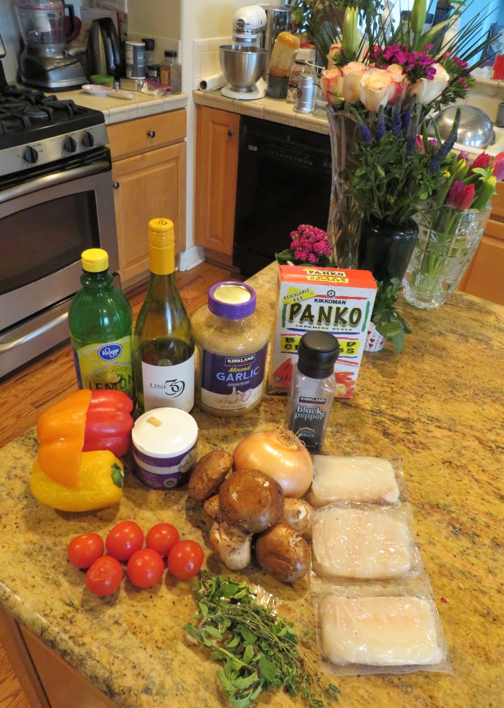 We decided to have some fish for Good Friday. I had something in mind, but when I started pulling out my ingredients, I realized I didn’t have everything I needed and I didn’t fell like going back to the store, so I changed things up a bit, and worked with what I had instead. I do this quite often, and things always turn out just fine. 🙂 What I ended up making was panko coated cod over roasted vegetables in a lemon-herb sauce. It was very tasty.