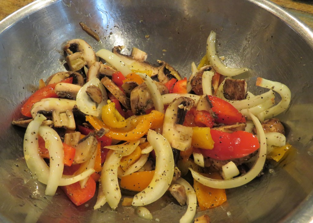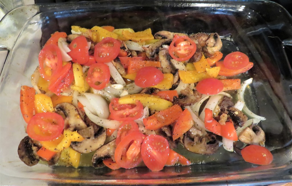 Toss the peppers, onions and mushrooms together in salt, pepper and olive oil, then place them in the baking pan and roast for about 30 minutes. After about 20 minutes, add the tomatoes and the rest of the lemon-herb mixture used for the fish and continue to cook.