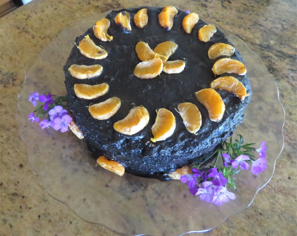 I added orange slices all around the top for decoration. Chill until ready to serve. Then slice and enjoy with family and/or friends. If you like chocolate and you like oranges, you are going to love this cake, even if the frosting doesn’t quite come out like you were hoping for. š