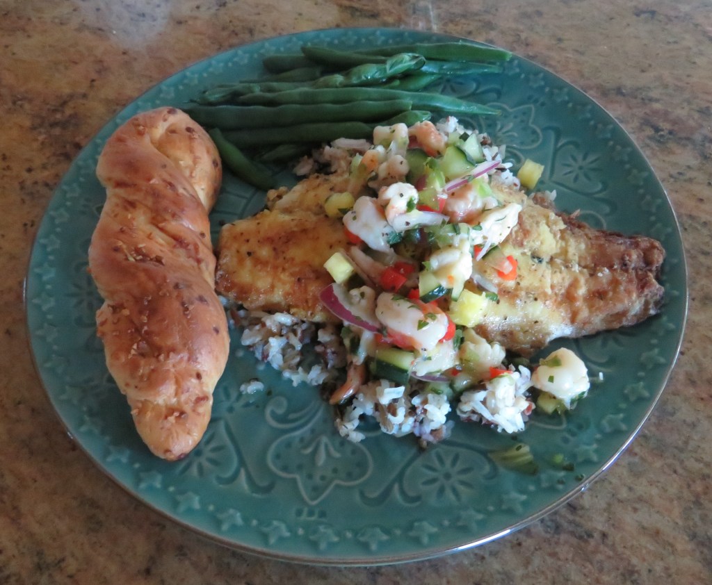 Once everything was cooked, I plated it all up, restaurant-style of course, on a bed of wild rice, topped with ceviche, with green beans and my cheesy bread twists on the side. Cheesy Bread Twists And to finish it off, a glass or two of some rich, buttery, oaky chardonnay to complete the meal.