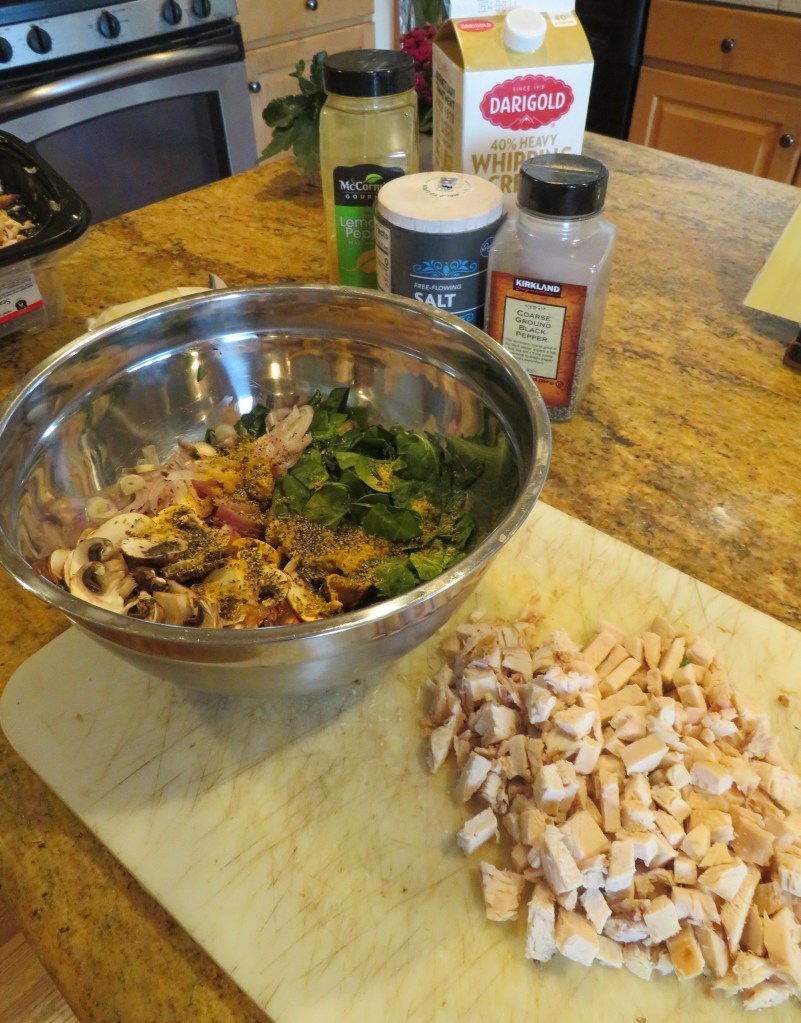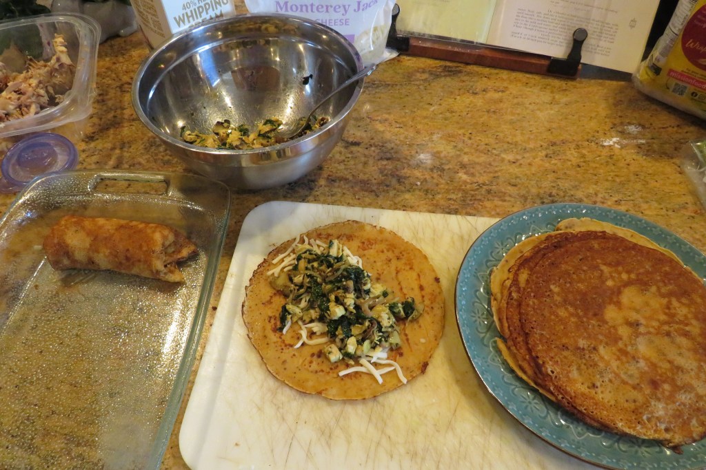 I love crepes, but don’t make them all that often. I like them more than Larry does. I like savory crepes and I like sweet crepes. Savory crepes are used as the main course of a meal, where as sweet crepes are usually eaten as desserts or breakfast. I wanted to vary our menu a bit for dinner, so I made crepes stuffed with chicken and spinach then topped them with a mustard cream sauce. And, I got to use up a lot of my leftovers in the process. WHOOOO HOOOO!!!!