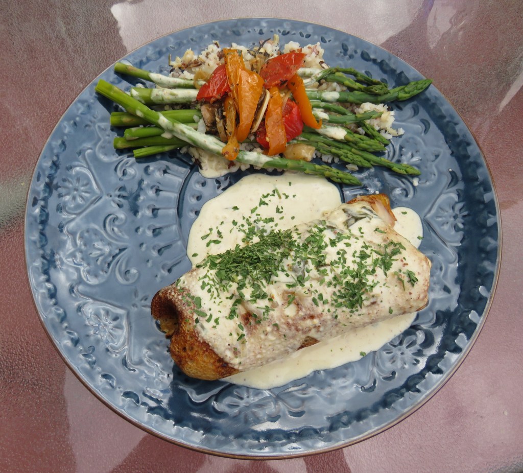 Once everything is ready, top the crepes with sauce and serve alongside your favorite side dishes. I had some wild rice and asparagus. Then I finished it off with a nice chardonnay. It was a perfect spring meal.
