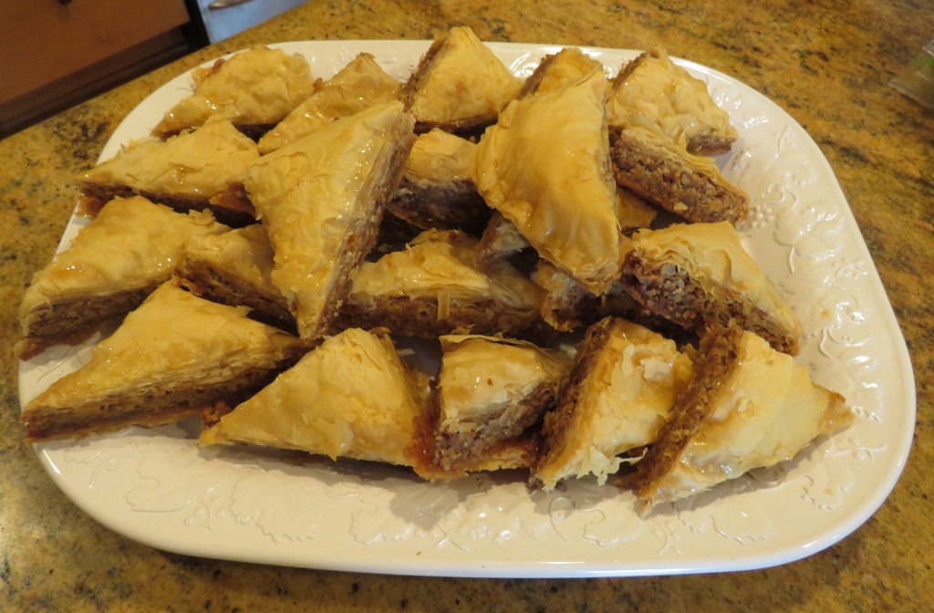 My other dessert for tonight is baklava. I confess though, I did NOT make it this time. I can, but why? I have my favorite local Mediterranean restaurant, called Mumtaz, Mediterranean Mumtaz that makes it perfectly, so it’s much easier and more convenient to buy it from my friend Mo than to make it. I am also helping a small local business. ๐