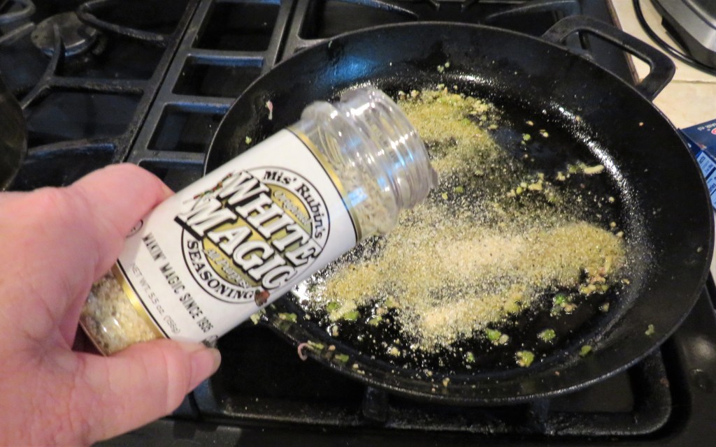 Add additional oil if needed and about 1 TBSP of the Mis’ Rubin’s White Magic Seasoning and the scallops. Cook for about 1-2 minutes per side, or until the scallops begin to brown.
