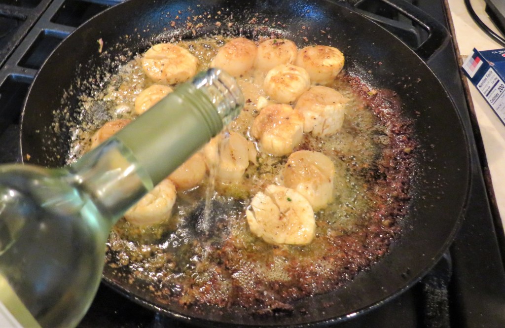 After the scallops are lightly browned, add the wine and deglaze the pan.