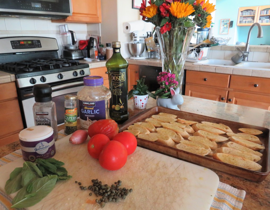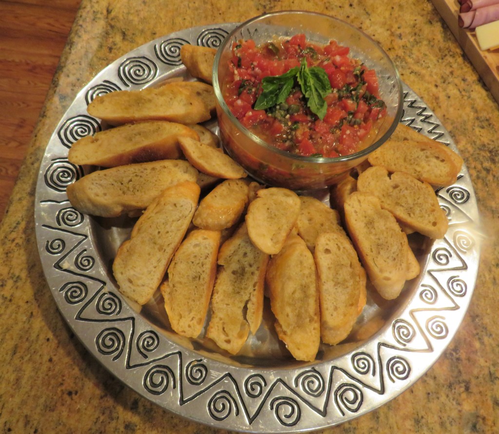 It was time for our monthly trip to InVINtions, A Toast to InVINtions! which meant it was time for more nibblies. I tend to make the same thing all the time, because charcuterie trays are easily transportable and go well with wine tasting. But I get bored, and don’t like doing the same thing all the time. So this time I changed it up a bit. I still did make a cheese and meat platter, and still brought a tray of dolmas (stuffed grape leaves), olives, artichoke hearts and baby corn, but I also made some bruschetta to take along too.