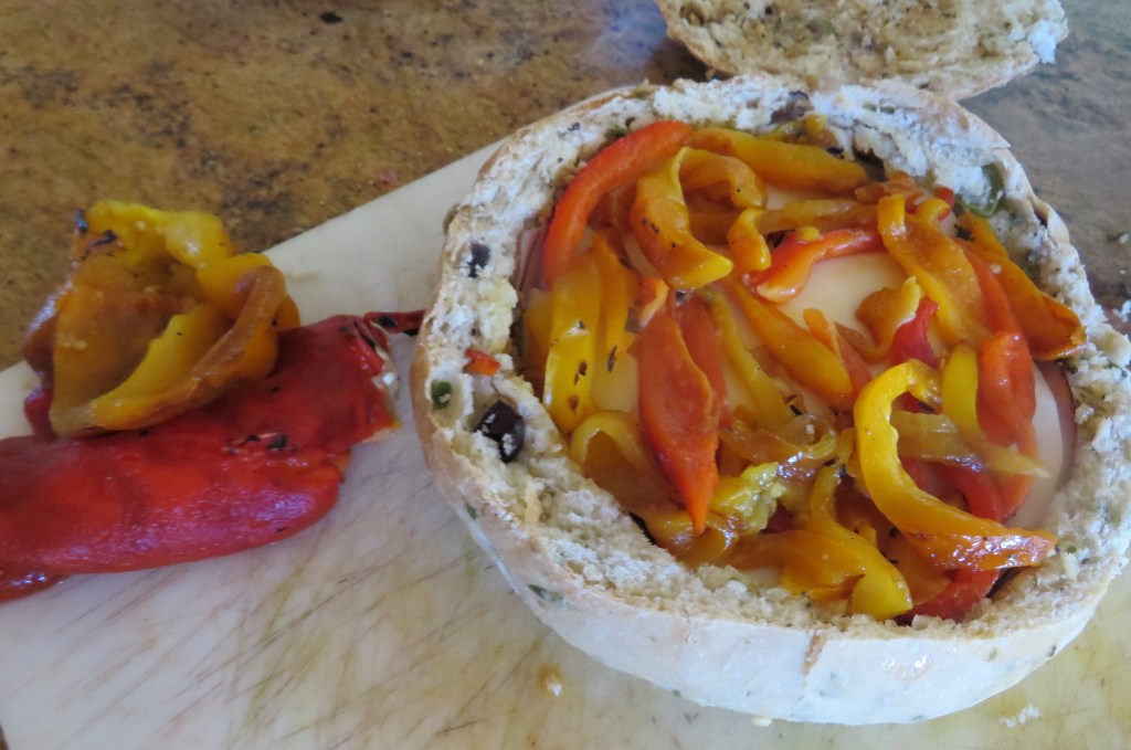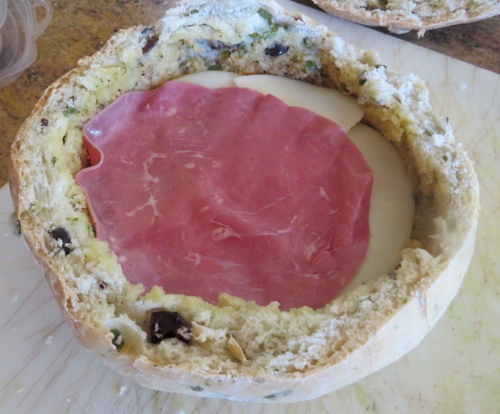 First, I hollowed out one of my round loaves of olive bread, saving the filling for croutons. Then I brushed the remainder of my latest batch of orange vinaigrette all over the inside of the bread. Oranges and olives go great together, by the way.