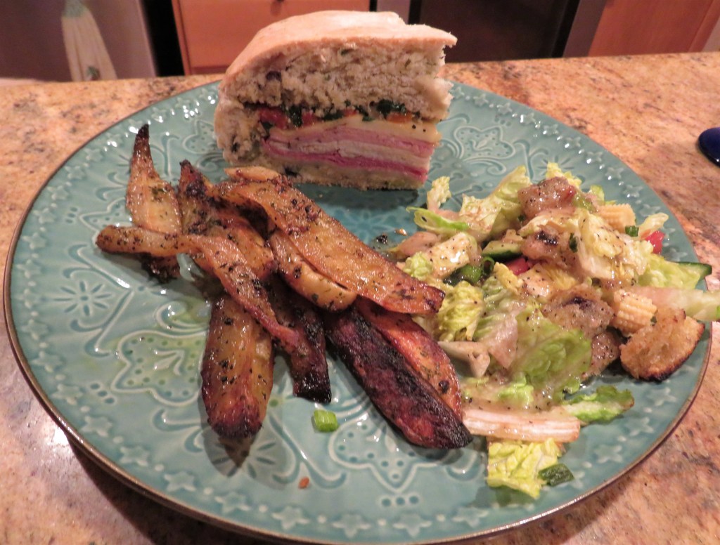 When you eat muffaletta, you are getting your whole meal all in one, in one sandwich. It’s got your vegetables and salad already packed into the sandwich. So with every mouthful, you get a little bit of everything. As with any recipe that has been around for a long time, there are many, many different variations. This is but one of many endless possibilities. Enjoy and laissez le bontemps roulez!