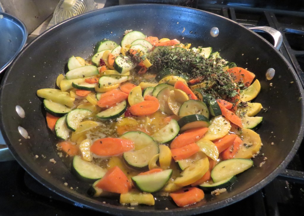 We go to Mexico all the time. As you know, we LOVE diving in Cozumel. When we eat out, often the vegetables served are sauteed zucchini, crookneck and carrots, mixed with cumin, oregano, and sometimes peppers. This is exactly what I did too. I also threw in some of my lemon verbena, which is already growing wild and taking over my backyard. But I LOVE cooking with it. 🙂