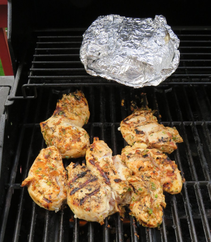 First, I marinated the chicken for about 5 hours, in a spicy tomato sauce. Then we grilled it up when we were ready to eat. I reserved some of the sauce and cooked it down to serve on top of the cooked chicken as well. My sauce was a quick version of an adobo sauce.