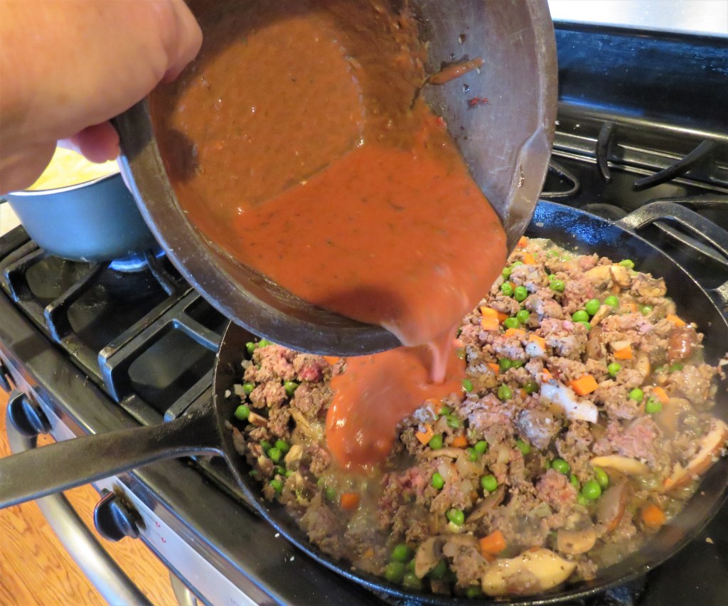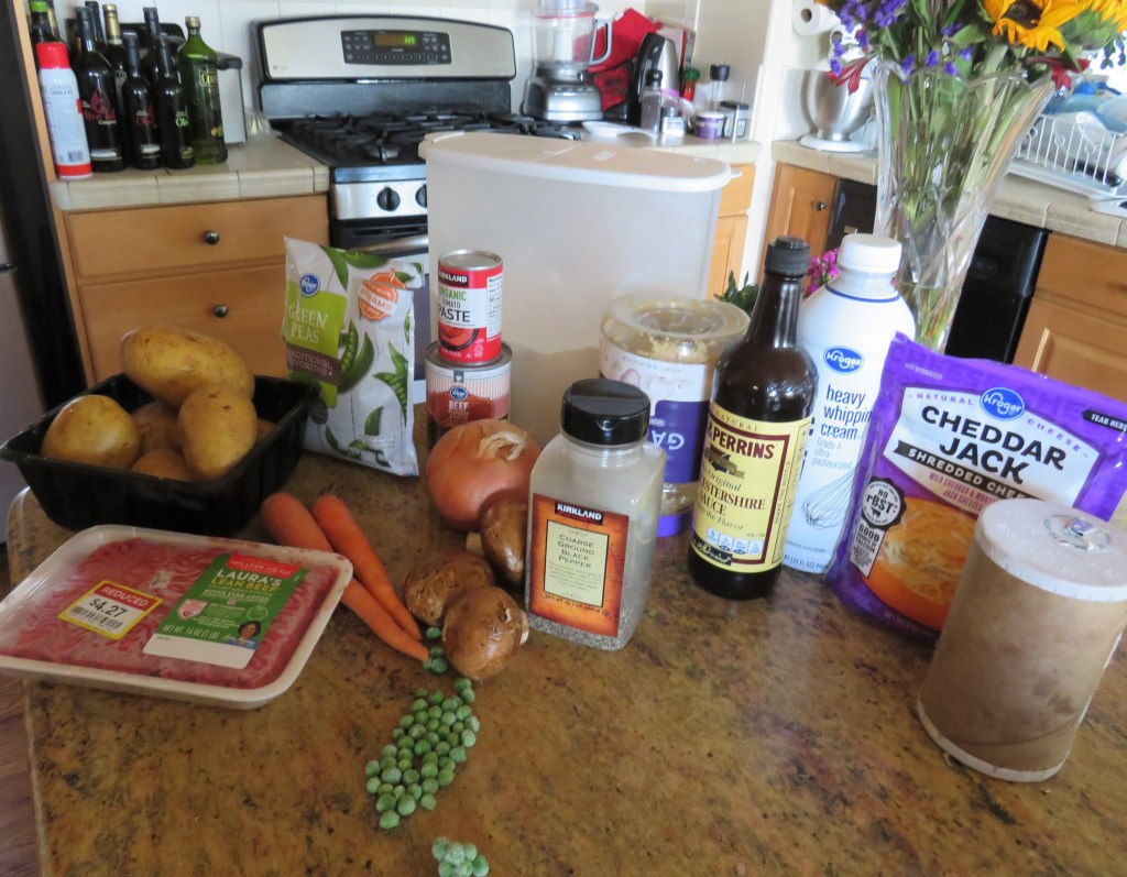 We had ground beef down from the freezer. Our weather has once again been wacky, and with it being cooler once more, it made for a perfect night to have something warm and straight out of the oven for a warm and comforting meal. I decided to make a cottage pie. I made it in the traditional manner, sticking to my British, Scottish and Irish roots, though as usual, I changed it slightly by adding mushrooms and garlic. I love mushrooms and can easily eat them in everything, and usually do too. And as far as garlic goes, no dish is complete without garlic. 🙂
