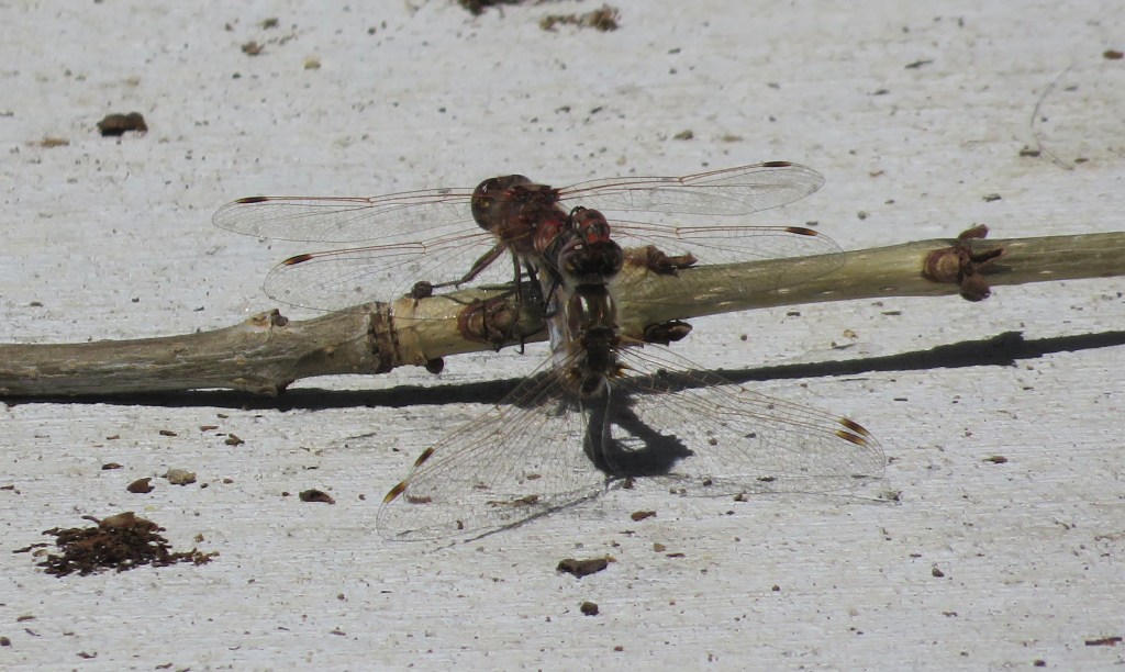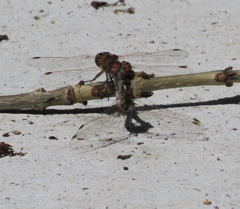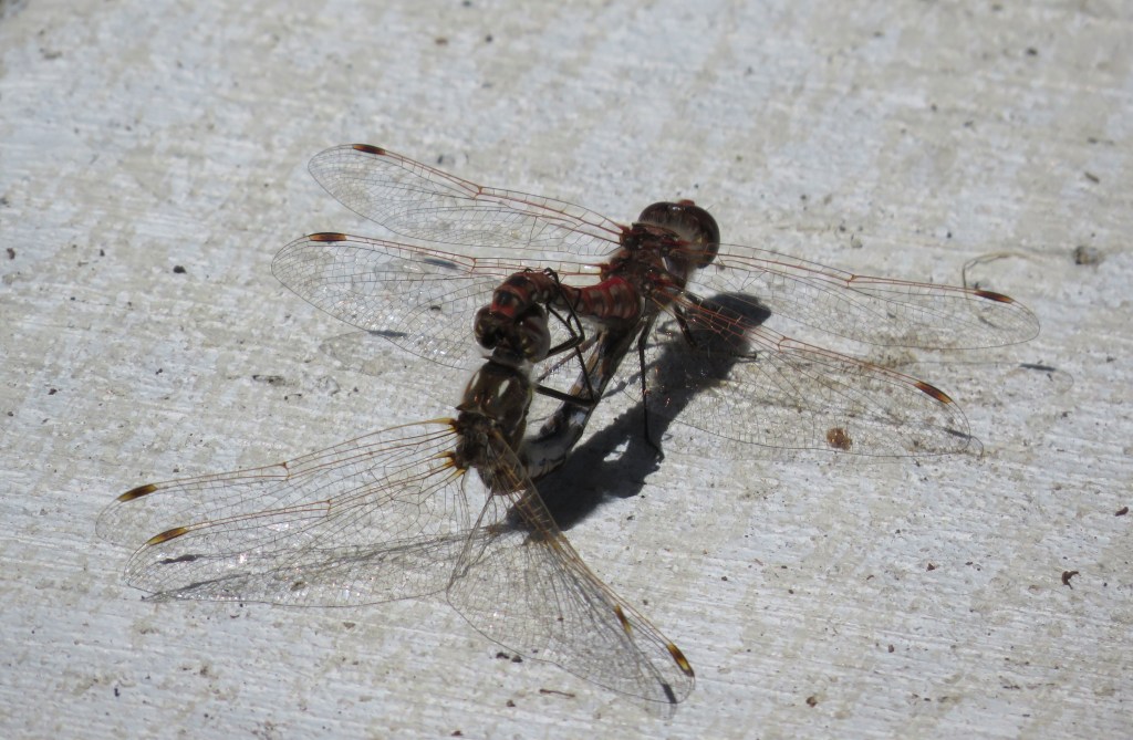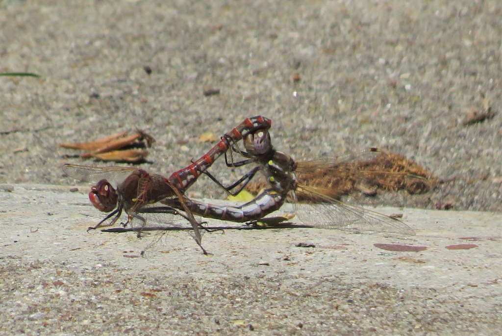 I never know what I am going to see when out walk-about. Most of the times I see birds, or squirrels, or ducks or geese, or some combination thereof. But every now and then I see something totally unexpected. This time I saw two dragonflies mating. At first, I thought a dragonfly had captured something. Boy was I ever surprised when I actually noticed what they were up to. Now that’s NOT something you see everyday. And they were exhibitionists about it too. Not only did they not move to someplace more private, but they were purposely staying on the same path I was on. They wanted me to take pictures of them. And though I felt like a voyeur, I did take pictures of them.