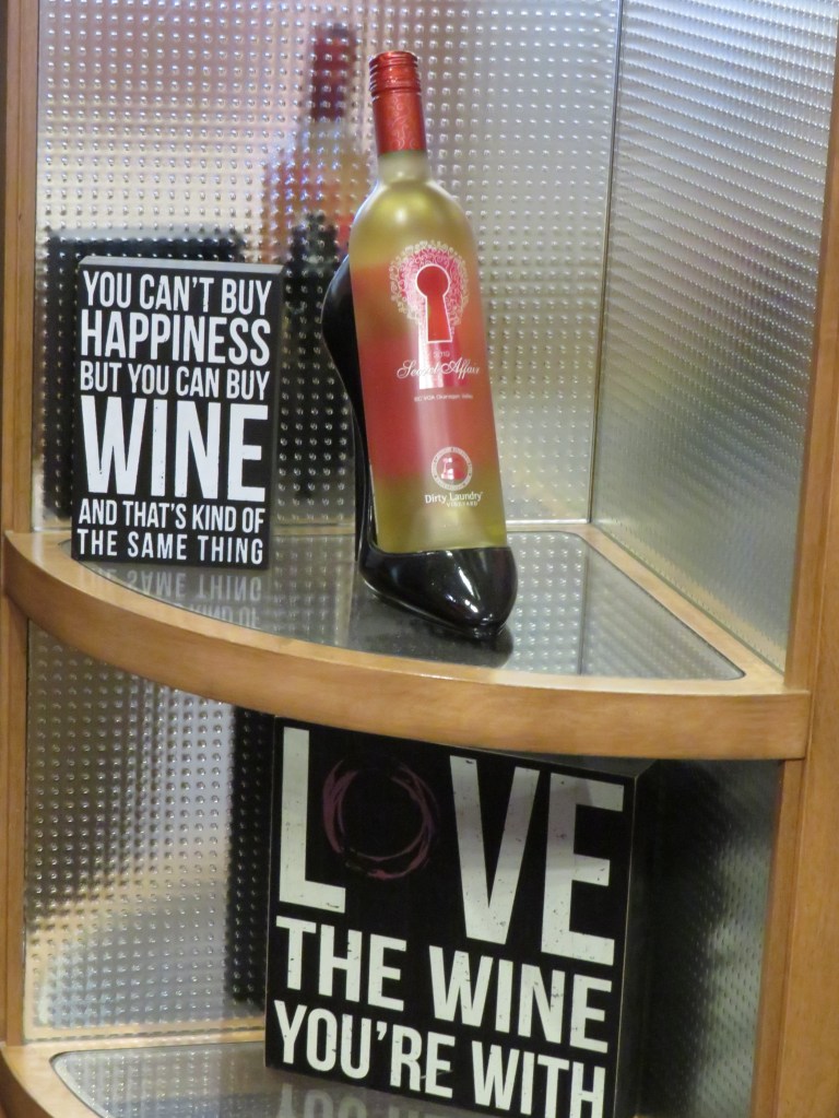Once we got inside those of us who didn’t know the story or history of the winery, went inside to be “schooled”. Of course we were doing some tasting too. I learned about the history of Dirty Laundry by the wine servers at the bar. After hearing the story of their colorful beginnings, I got “pinned” with a laundry pin.