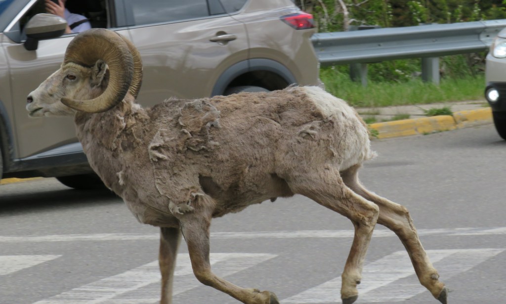 We saw a big horn ram crossing the street.