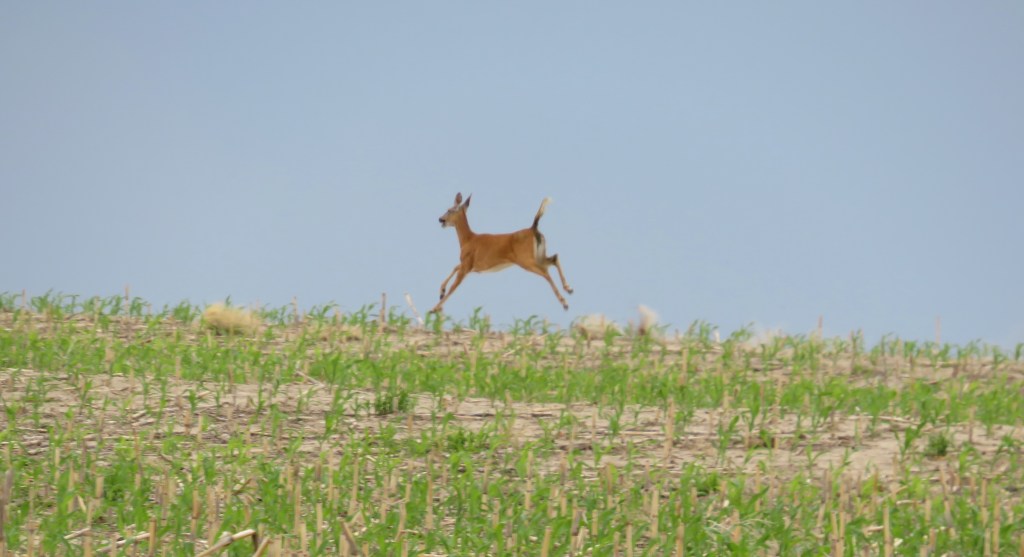 “Leaping deer” became a running joke with Dennis and Lee during our travels. Lee had commented on the deer signs that all looked like they were leaping. The deer we saw in Kansas really was leaping. It was leaping through the tall grasses and was on the move.