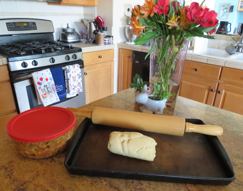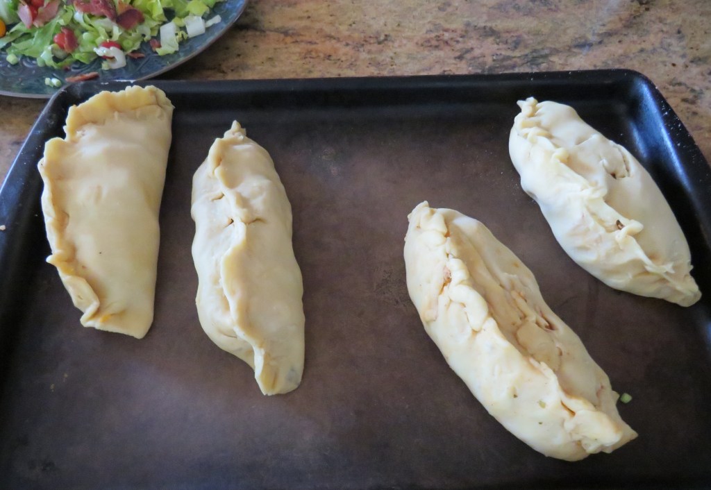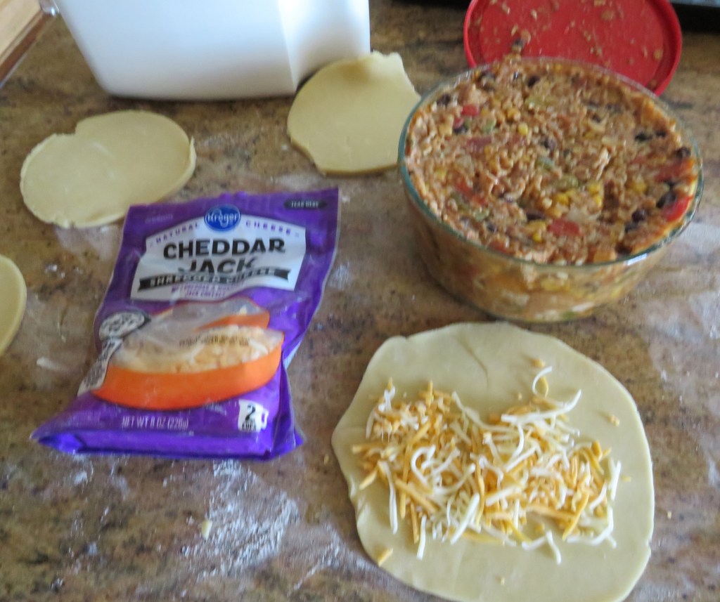I made my basic dough, added some cheese for Larry and fried them up. For really light and flaky empanadas, roll the dough very thin. Then fill them with what you like. I have a tendency to overfill them, which makes folding them over a bit challenging at times.