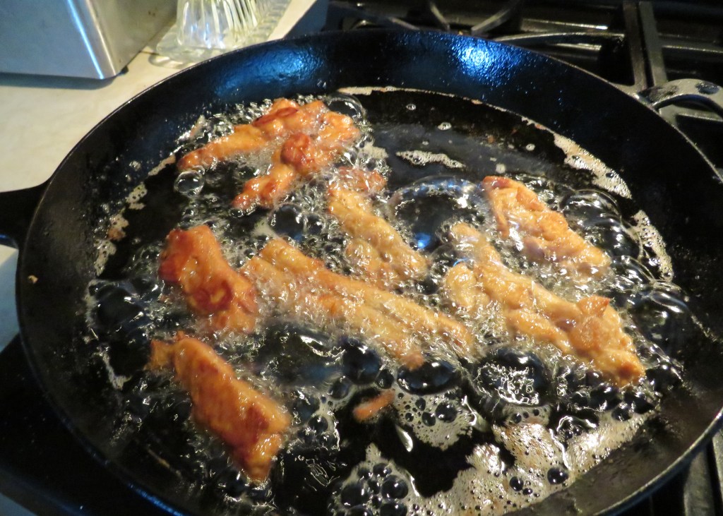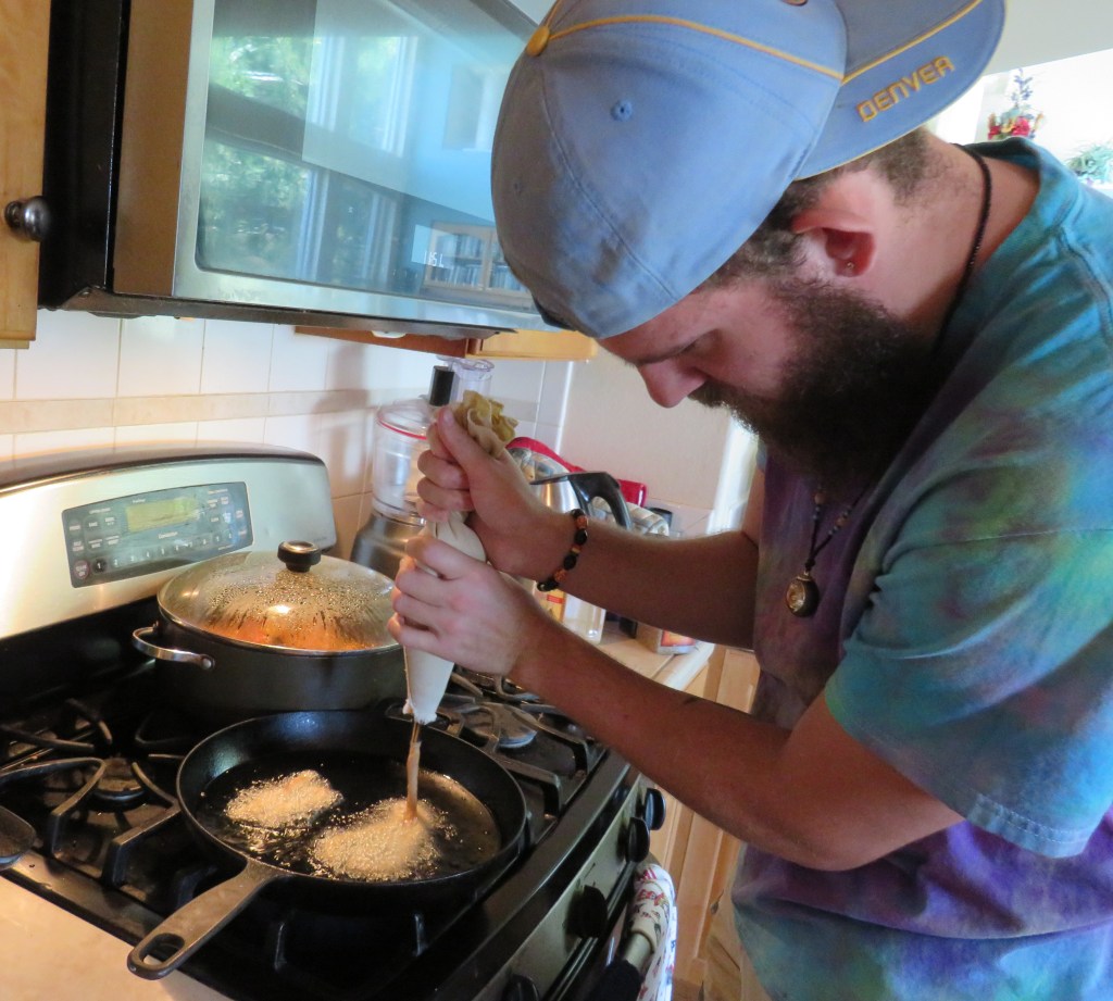 Bring the oil to 350*F, then carefully pipe out the dough into strips, about 5 inches long. Fry the dough for about 2 minutes per side, or until completely golden brown. Do not over crowd the frying pan.