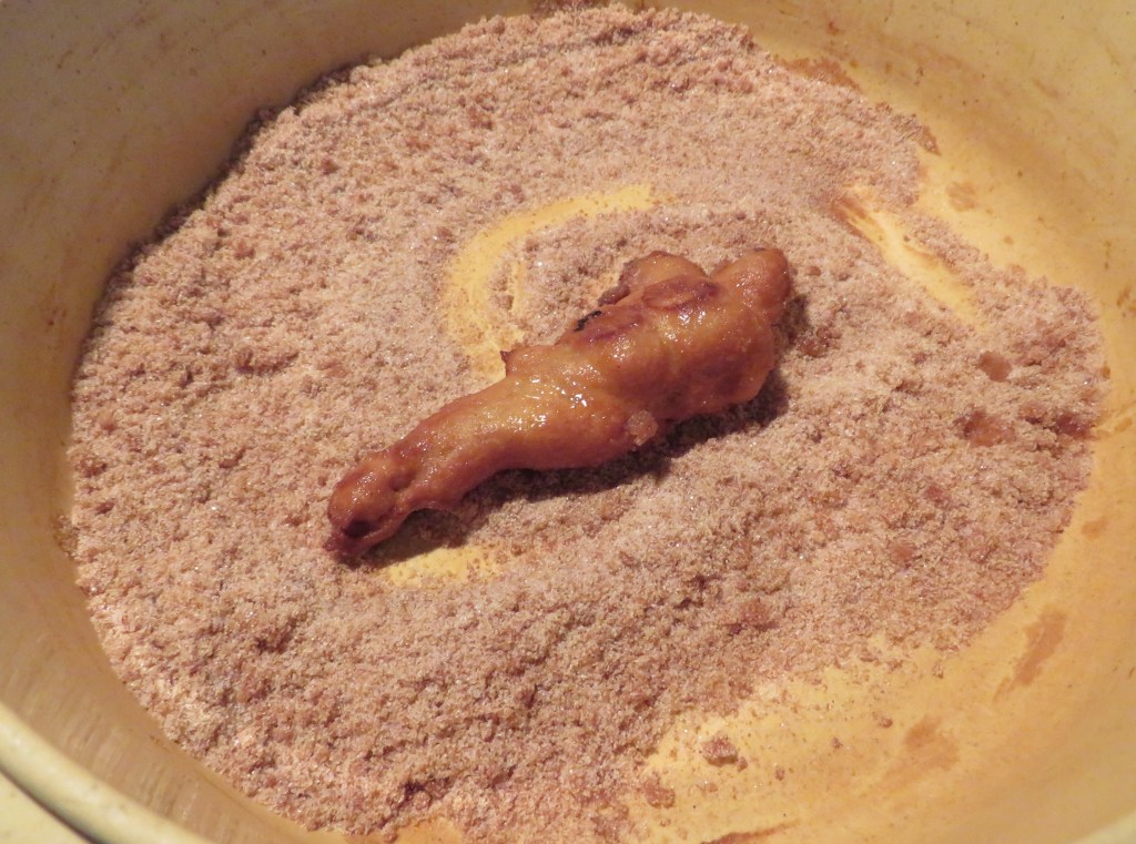 After removing the fried strips, roll into the sugar and cinnamon combination and thoroughly coat the churro.