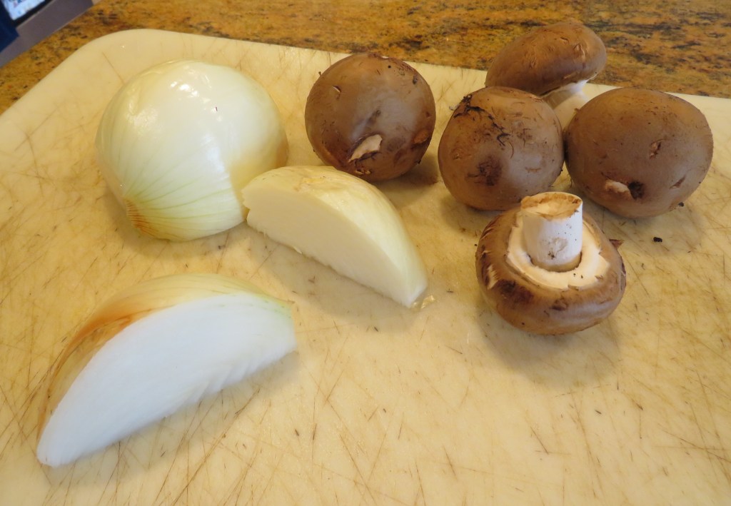 When the patties were made, I slapped them on a hot grill and cooked them to a nice medium, with just a hint of pink still left inside. As the burgers were cooking, I sliced some onions and mushrooms and sauteed them in a little olive oil and butter and salt & pepper.