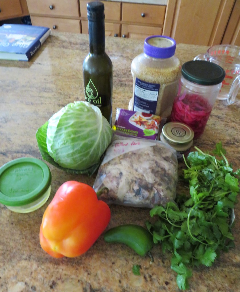 We had some pulled pork in the freezer that I used, then added some shredded Napa cabbage, red bell pepper, jalapeno, ginger, garlic, black garlic and ginger oil, pickled onions and cilantro. I didn’t measure anything. I just diced everything into small pieces and added small bits of each and mixed it all up as my filling for my wontons.