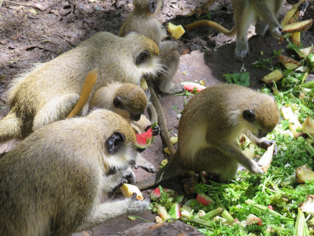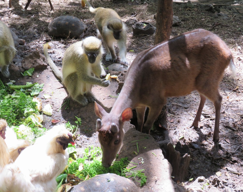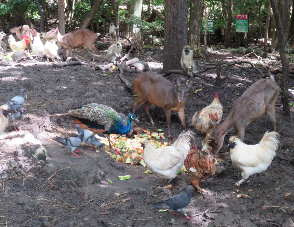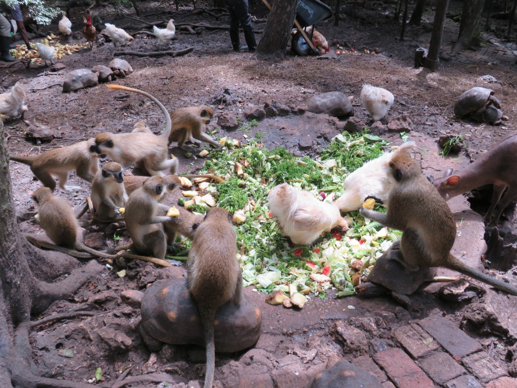 Feeding time was a hoot. The staff dumped a whole bunch of fruit and vegetables into a couple of locations and ALL the animals came out and dined together. The monkeys were hilarious. A few of them even sat on top of the tortoises.