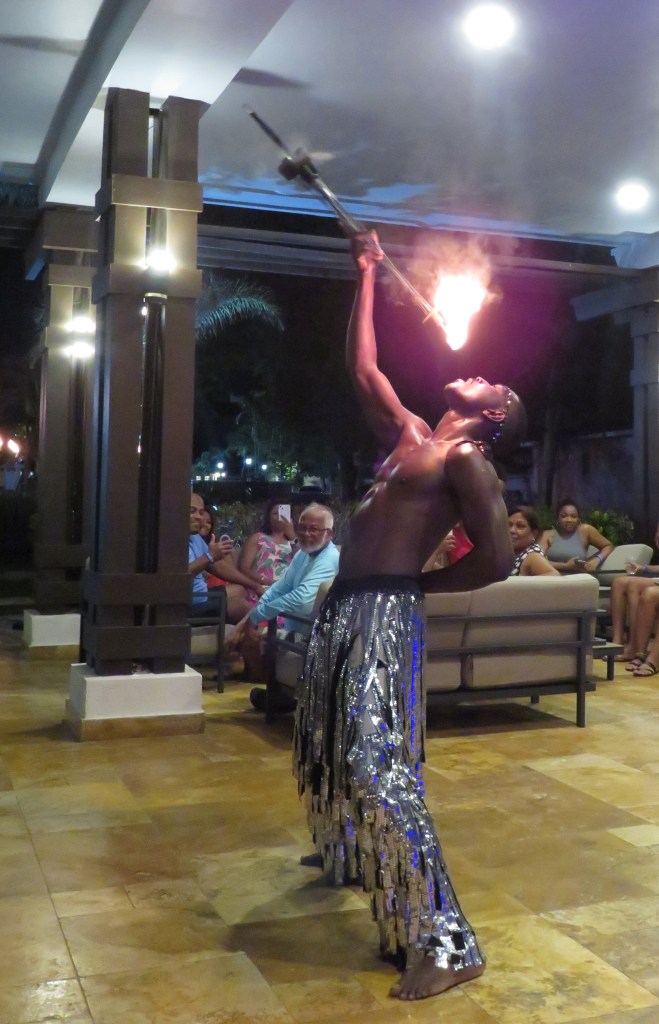We dined at our hotel’s restaurant one night. They offered a delicious buffet, and then followed it up with some local entertainment. First their was a guy playing the steel drums. Next came the fire dancer. WOW! Some of his moves were just amazing. I was scared just watching him, but he was fearless.