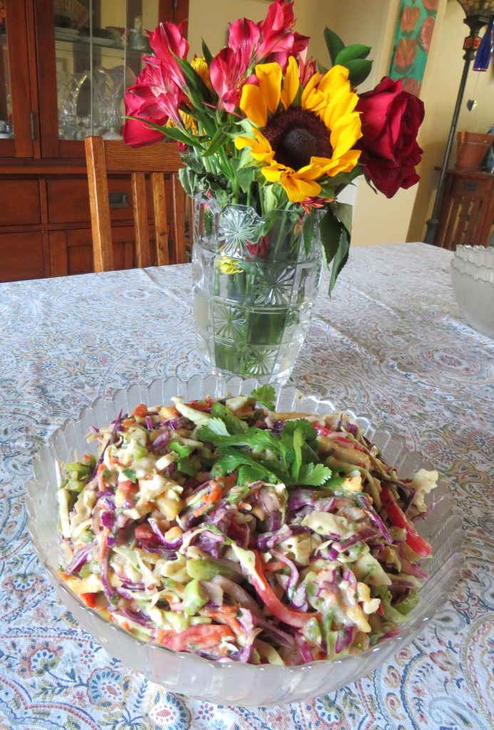 This is a spicy-sweet version of coleslaw. It goes very well with burgers, ribs, pork and chicken. HMMMMM! Other than the burgers, that is exactly what we served it with too. Imagine that. πŸ™‚